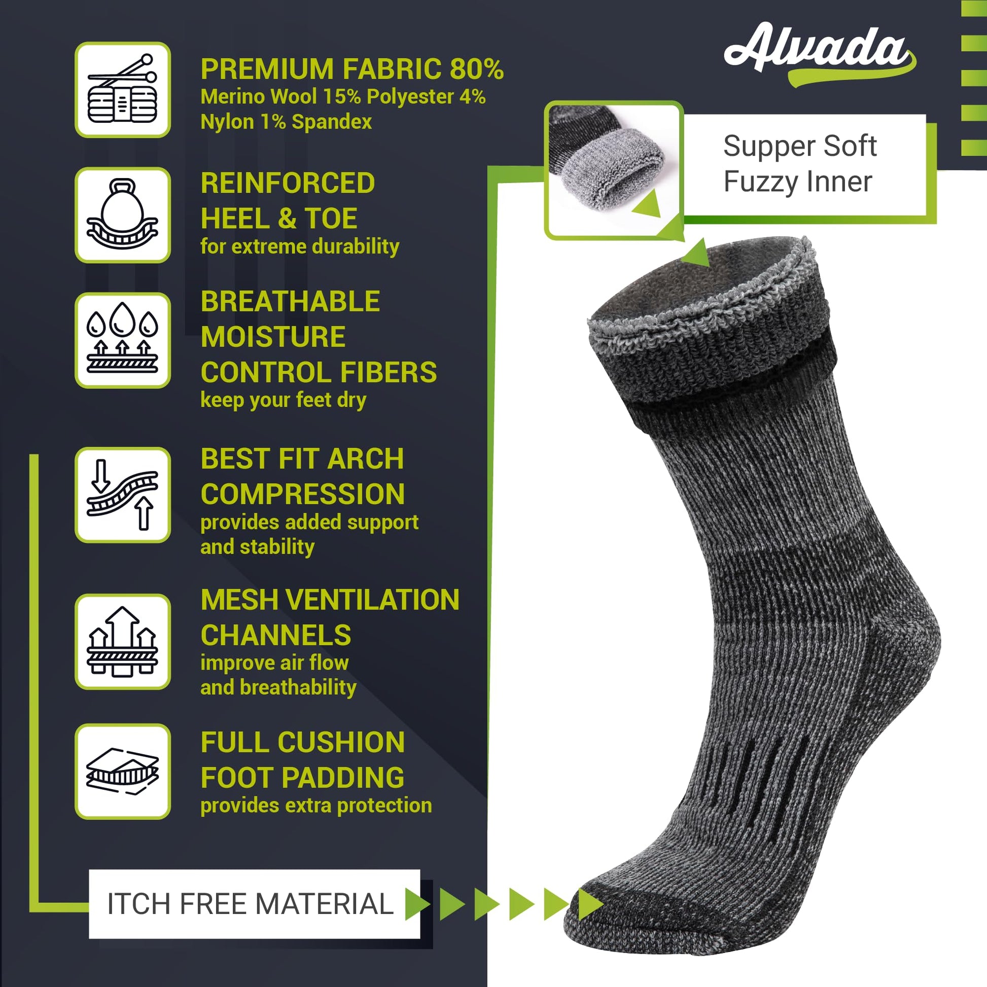 - FEATHER-SOFT COZY SOCKS - With a super soft, feather-like touch and cozy design, Alvada merino wool hiking socks will keep your toes warm and toasty even during the coldest winter chill, while protecting your feet from shoe bites and cushioning them from impact. Designed to help you perform your best all day long, these thermal socks will protect your feet from getting tired and are a must-have for everyone who values comfort!