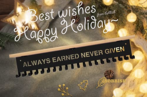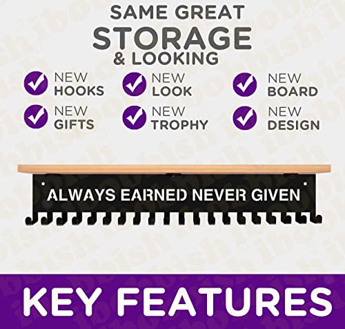 ALWAYS EARNED NEVER GIVEN Trophy and Medal Hanger Display Shelf,Soccer Trophy Shelf with 20 hooks for Medals,Sturdy Soccer Trophy Shelf in Black Metal Wall Mount Over big Medals Trophy Display Shelf