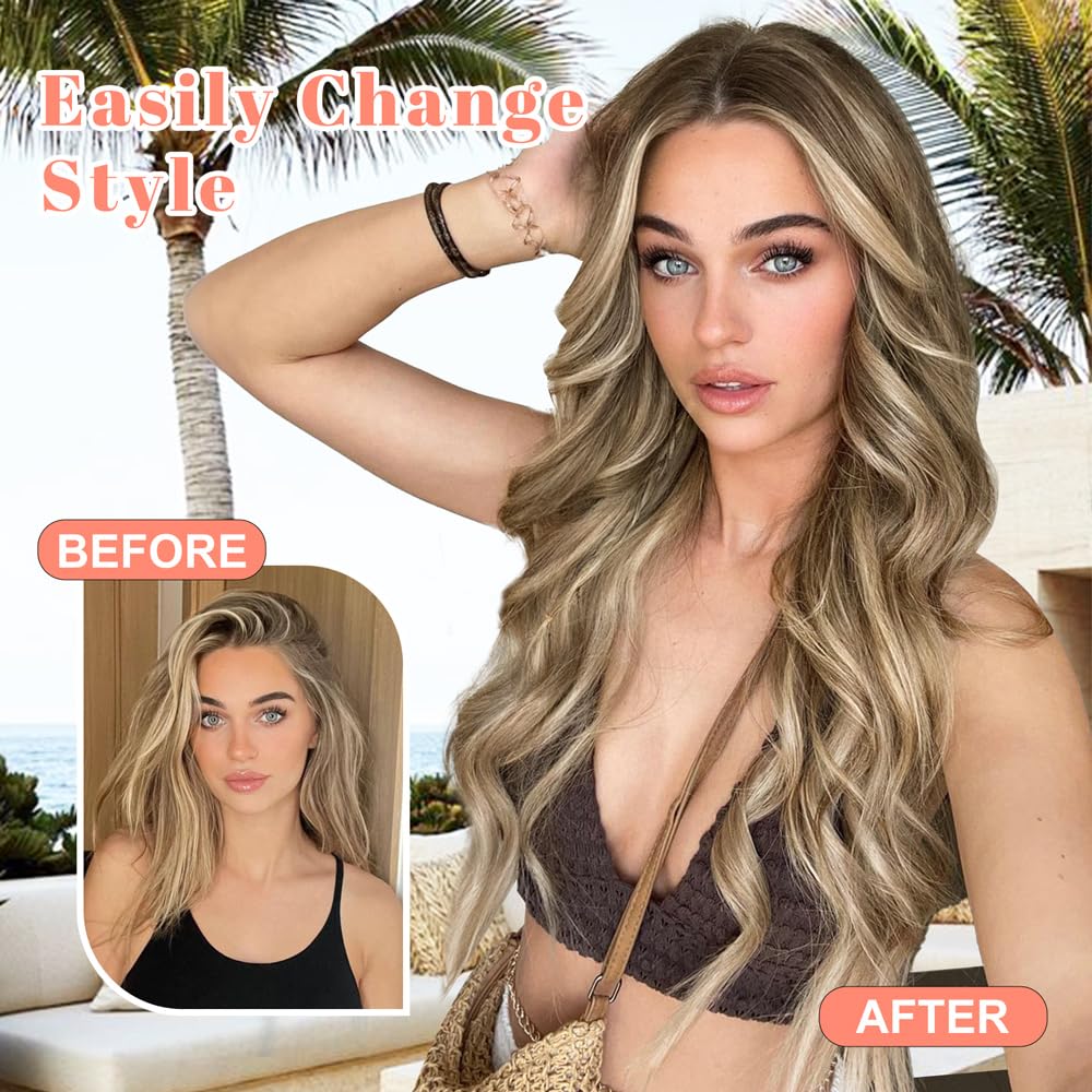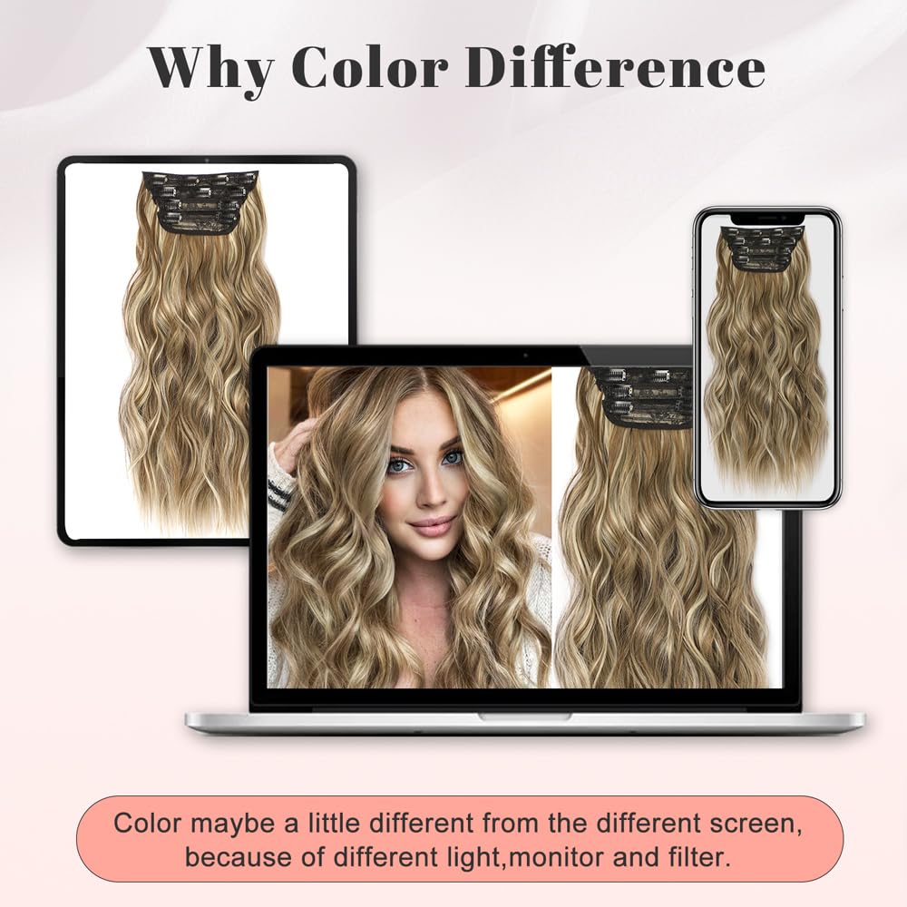 ALXNAN Clip in Hair Extensions for Women,Medium Brown Ash Blonde Long Wavy Hair Extensions Clip Ins 4PCS 20 Inch Synthetic Soft and Natural Thick Hair Pieces for Women