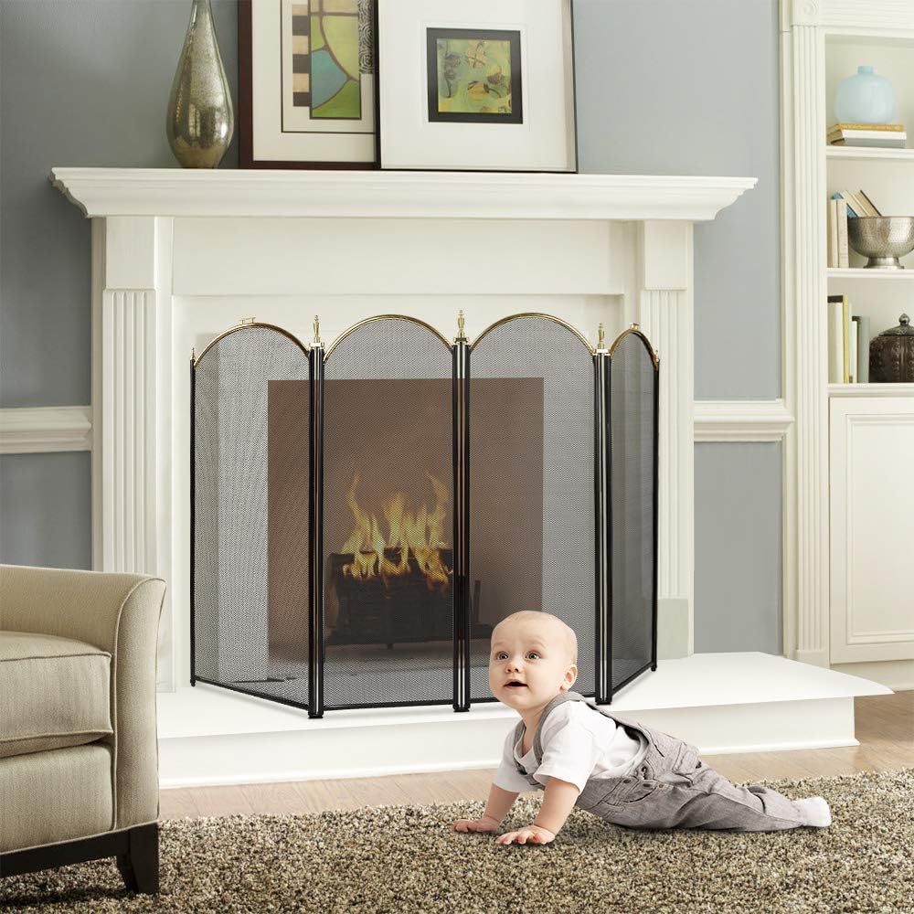 AMAGABELI GARDEN & HOME Decorative Gold Fireplace Screen 4 Panel Folding Ornate Wrought Iron Black Metal Fire Place Free Standing Gate Large Mesh Solid Steel Spark Guard Cover Outdoor Accessories