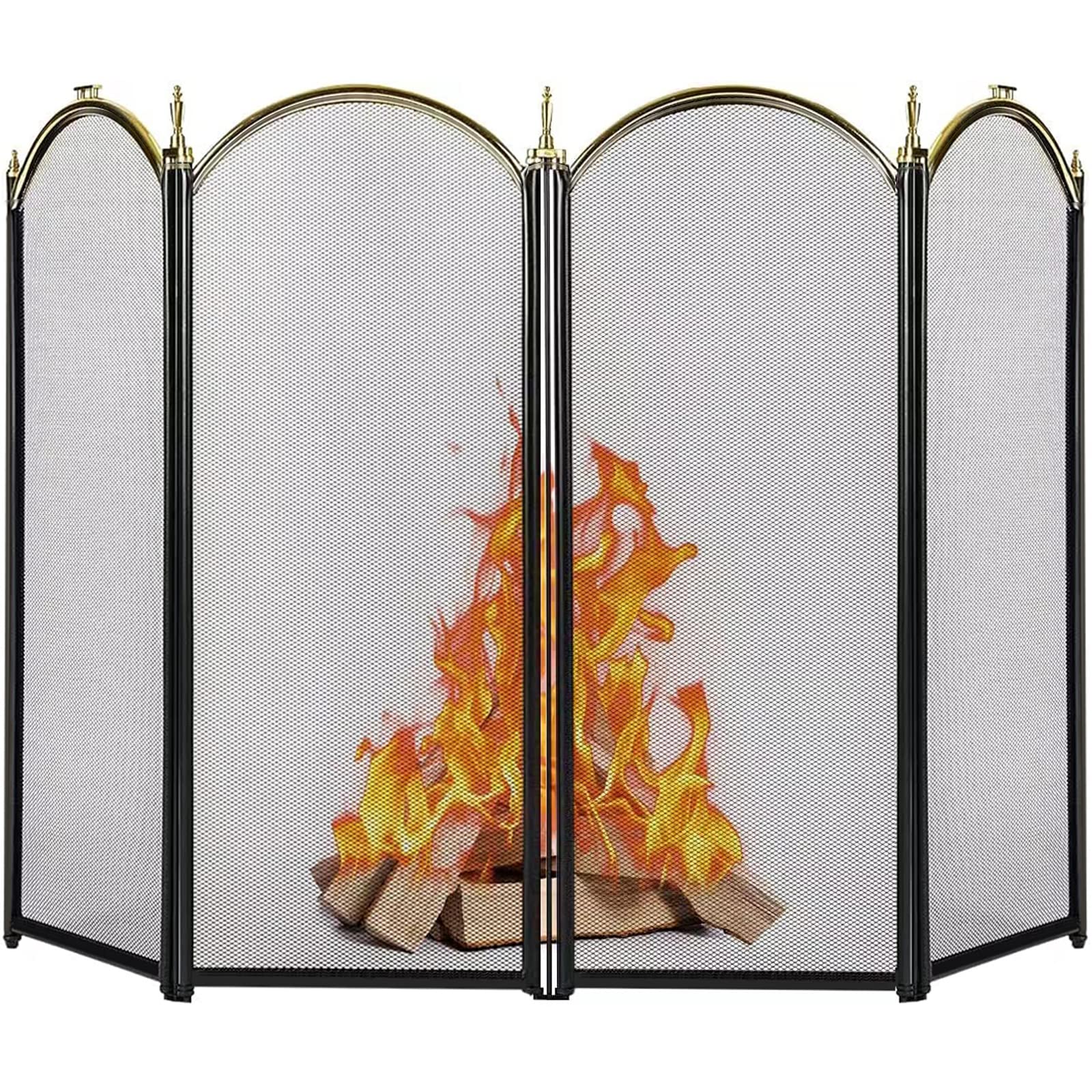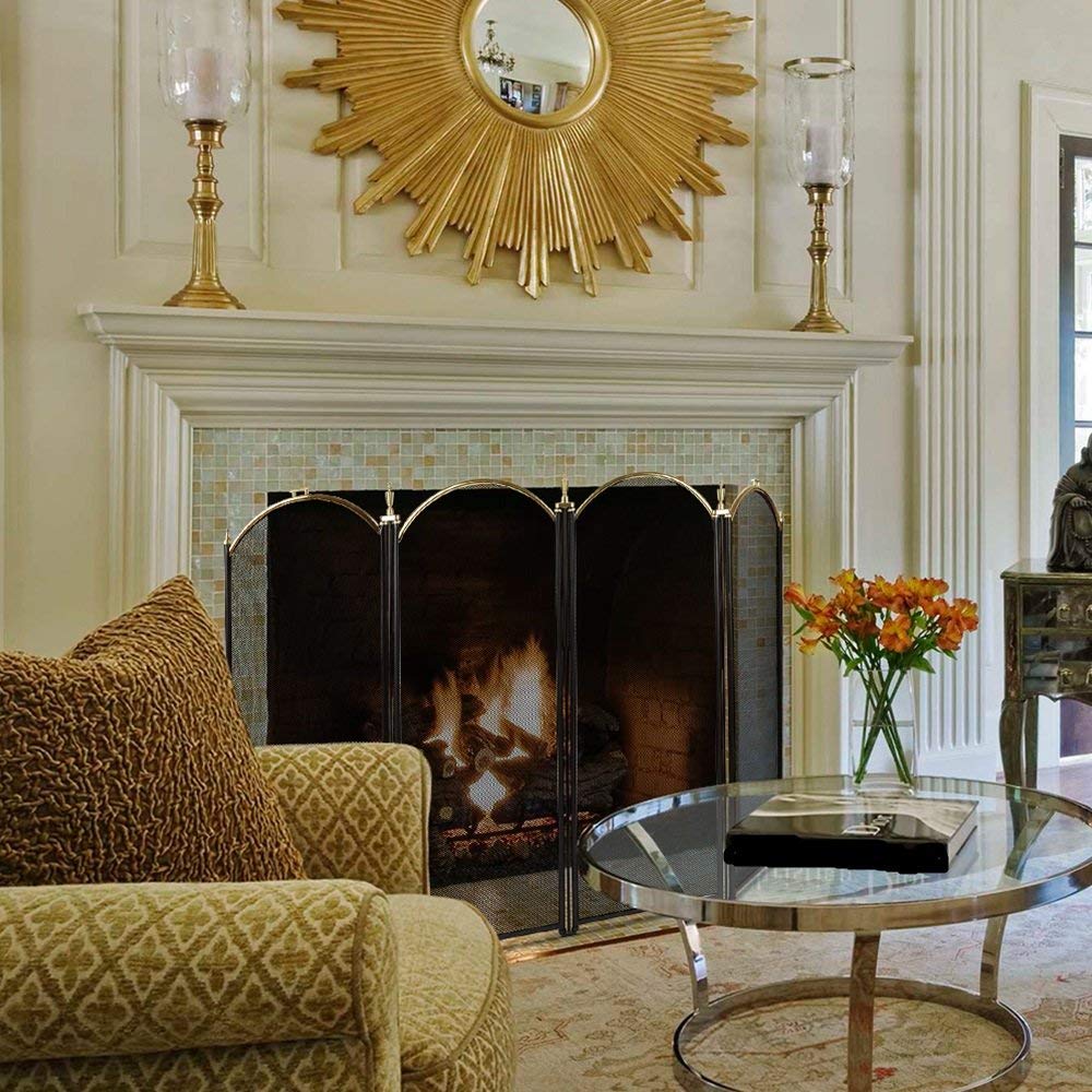 - High Quality: Gold wrought iron fire place screens comes with 4 single hinged panels in arched design can stretch to fit different openings. Essential decorative fireplace cover gate accessories constructed similarly with traditional brass and black fireplace enclosure, heavy duty pivacy firescreen fencing or indoor Christmas tree fence protector on Christmas day.