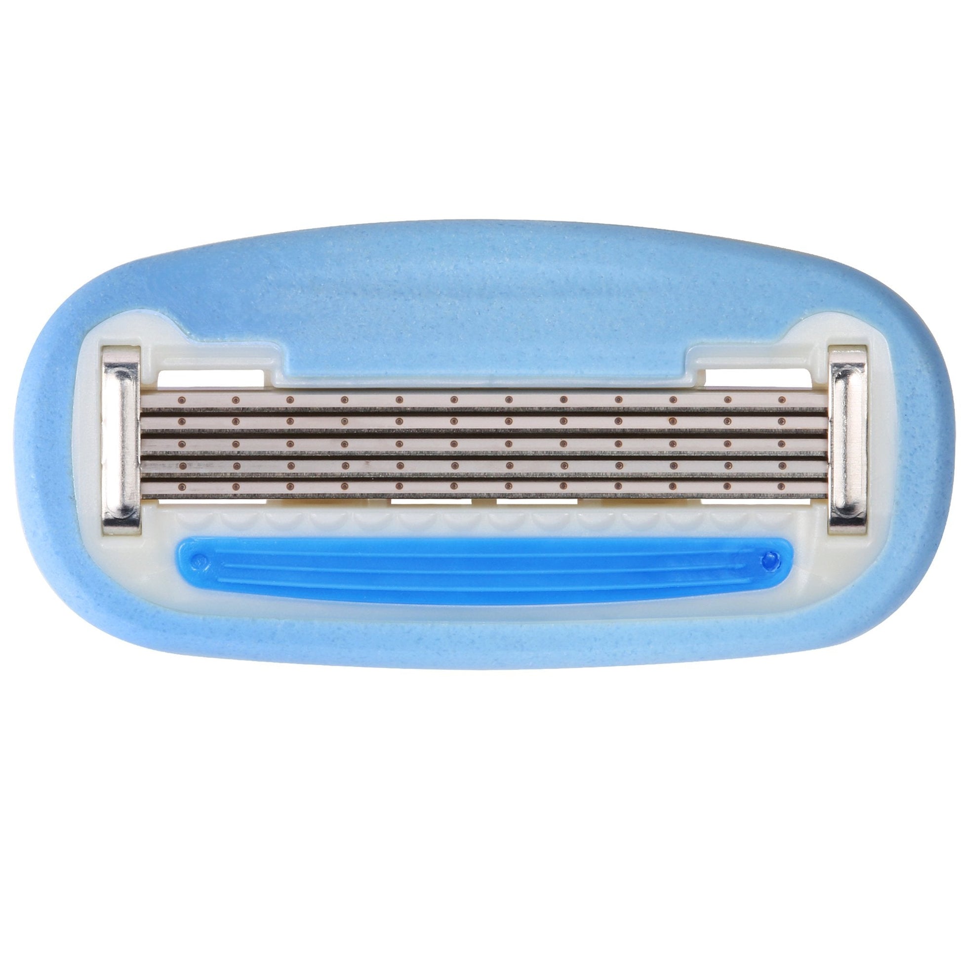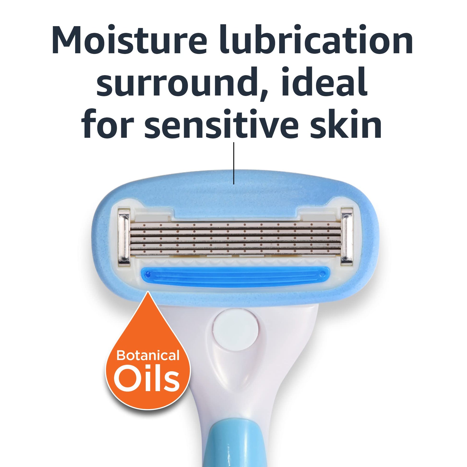 Details: The Amazon Basics 5-blade razor for women has a rounded razor cartridge and comfort-coated blades for a close shave. The lubricating surround with botanical oils helps reduce skin irritation for sensitive skin.
