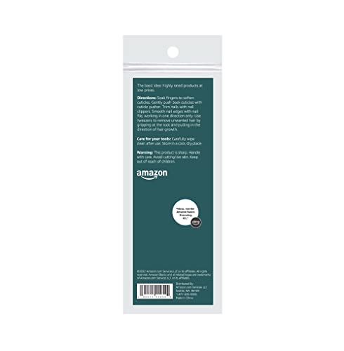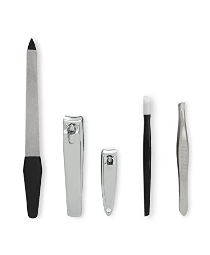 Details: Amazon Basics Basic Grooming Kit, Set of five basic grooming essentials, Includes finger and toenail clippers, angled tweezers, cuticle pusher, and a double sided sapphire nail file