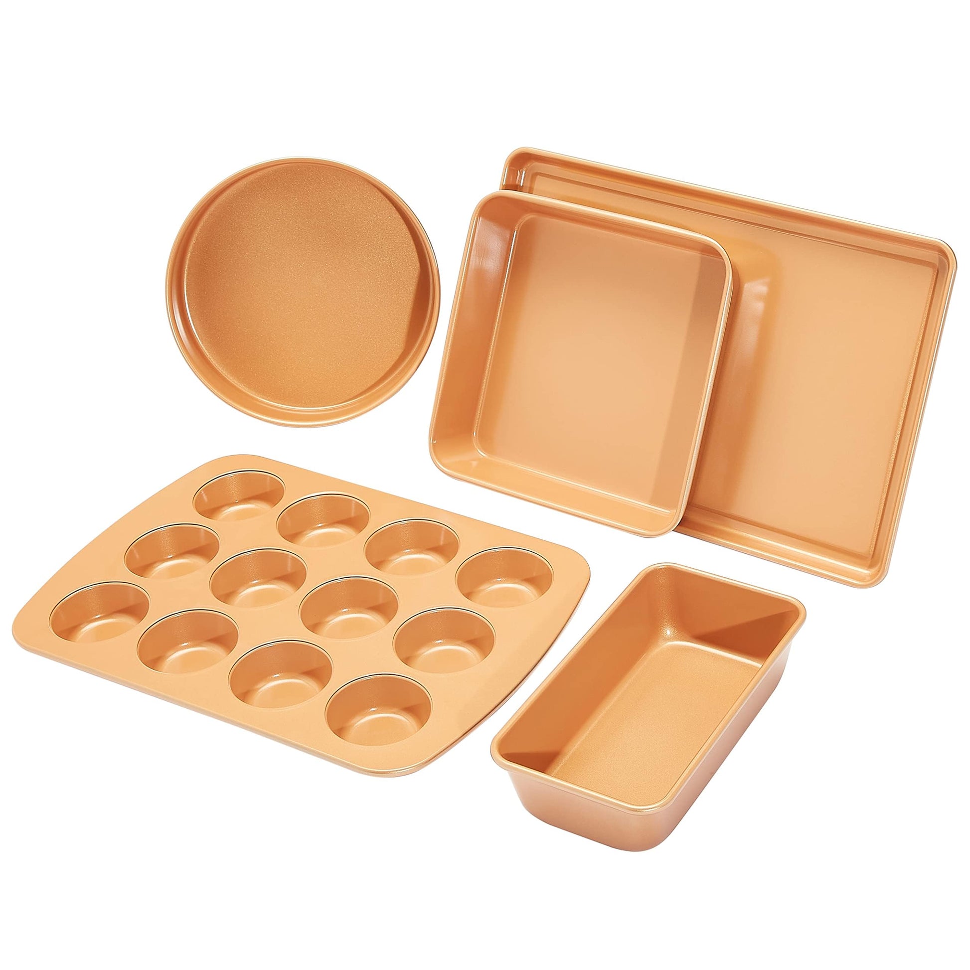 Amazon Basics Ceramic Nonstick Baking Sheets and Pans Bakeware Set, Non-Toxic, 5-Piece Set- Copper Color