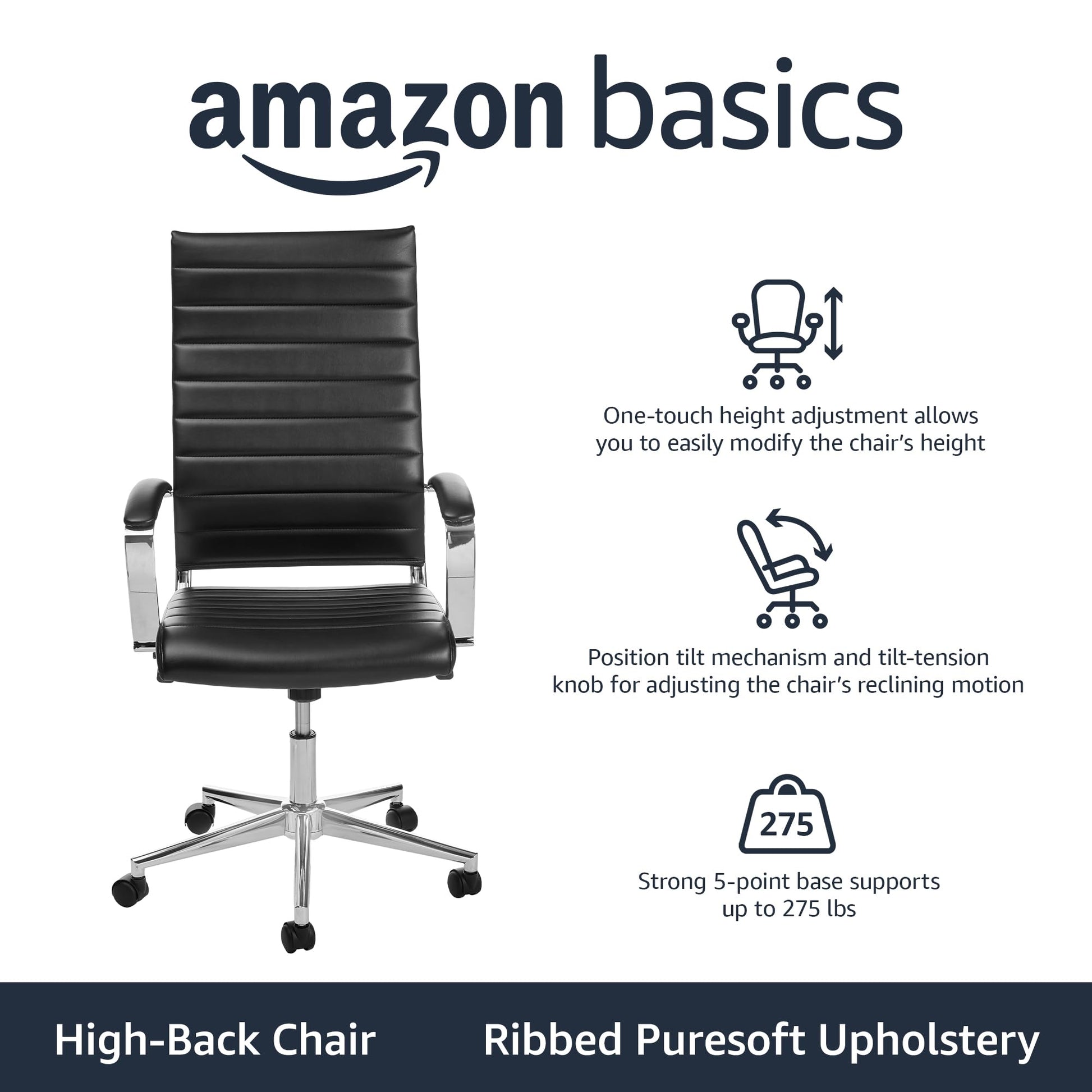 Amazon Basics High-Back Swivel Desk Chair, Ergonomic Ribbed Faux Leather Upholstery, Lumbar Support, Home Modern Style, Black, 45.25" x 24.75" x 23.25"