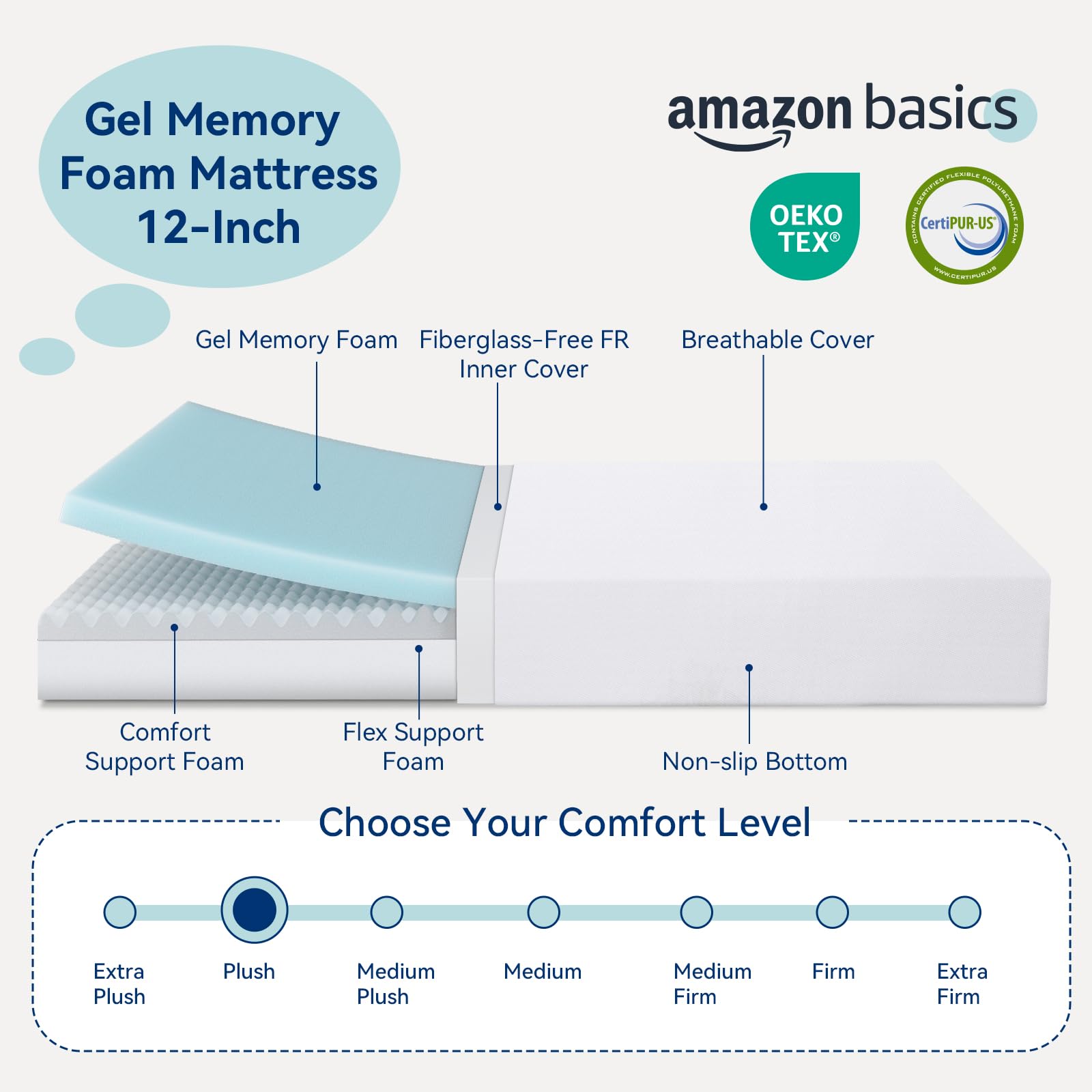 Details: Amazon Basics Memory Foam Mattress, Soft Plush Feel, 12 Inch, California King, White/Grey