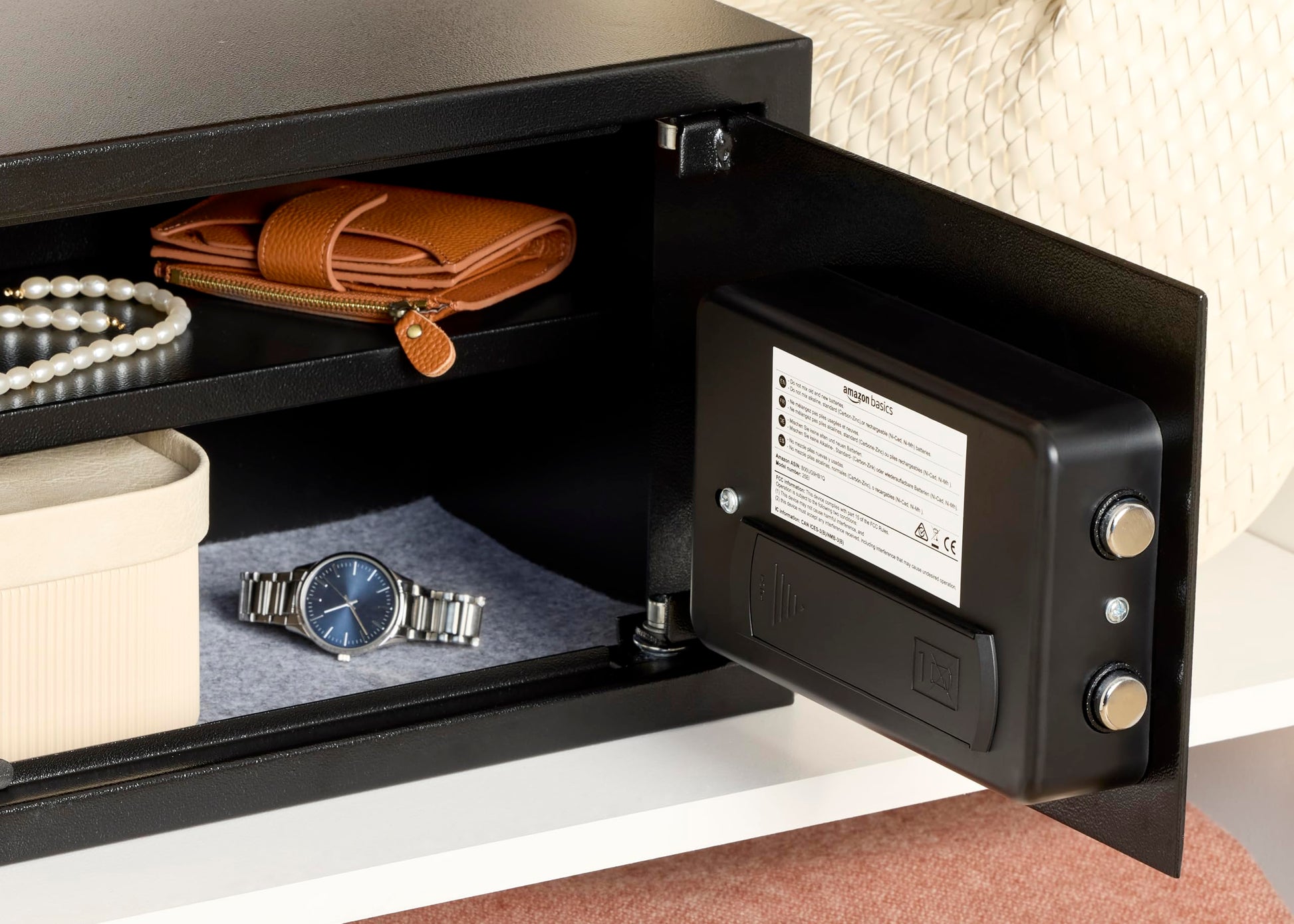 - Strong steel construction with carpeted floor to protect against scratches and damage; pry-resistant concealed hinges; adjustable/removable interior shelf.