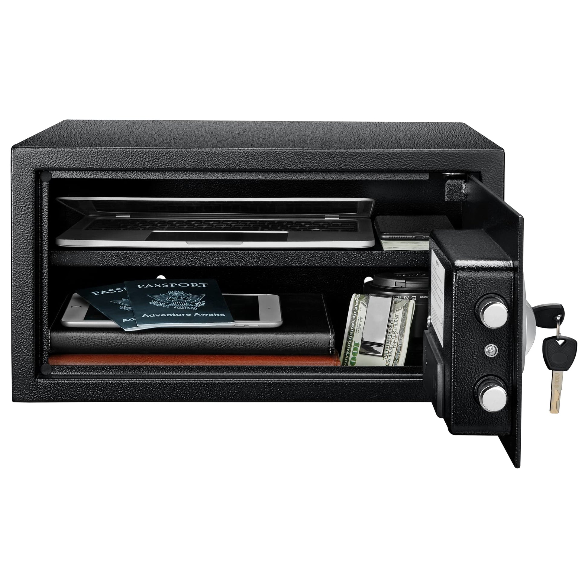 - 1-cubic-foot security safe with electronic lock and 2 emergency override keys