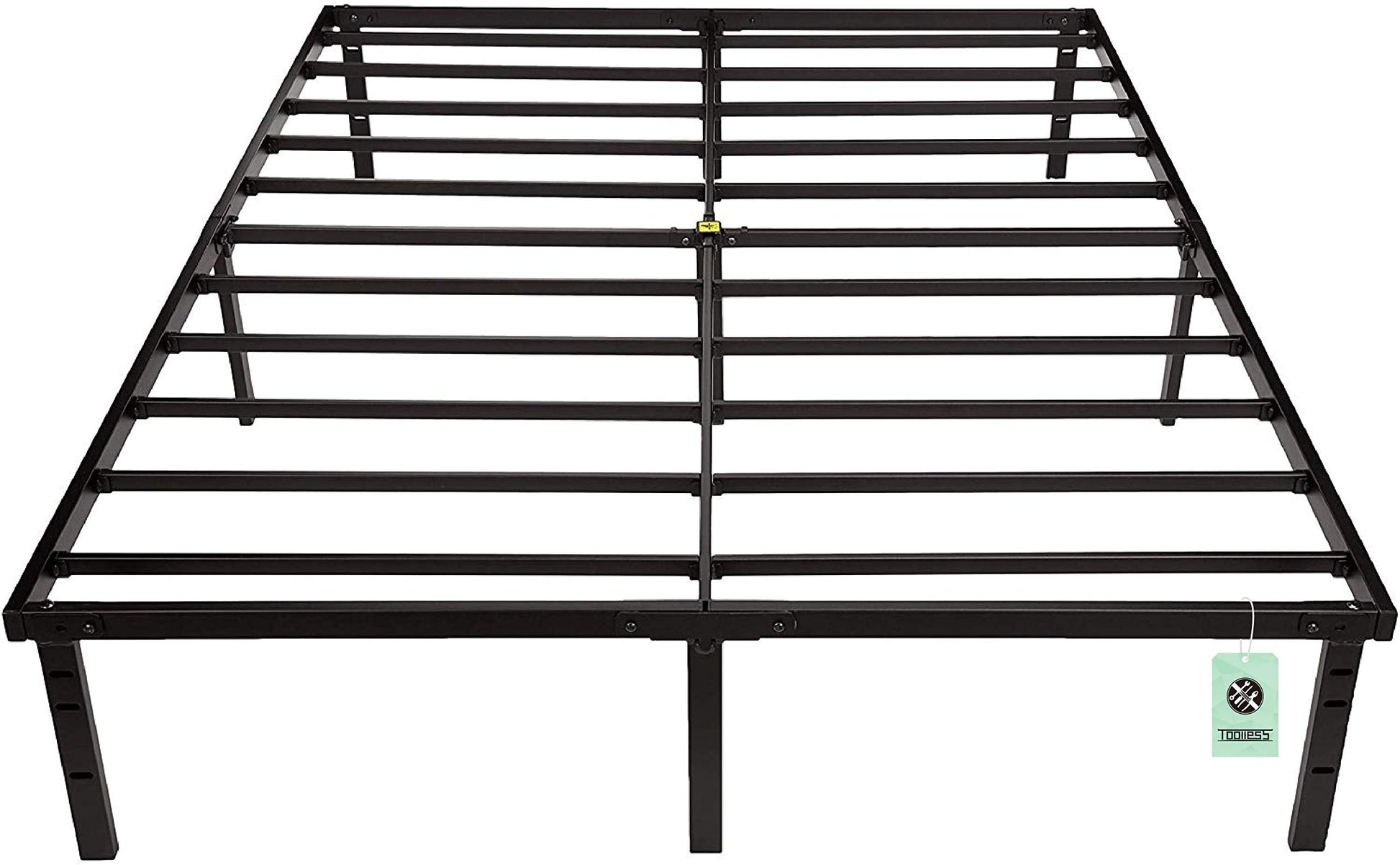 The Amazon Basics Sturdy Heavy Duty Non-Slip Metal Bed Frame is designed for those seeking a reliable king size bed frame. This king size platform bed frame serves as a perfect foundation for your mattress, eliminating the need for a box spring. Built with durable steel slats, the king bed frame platform provides support, distributing weight evenly for a noiseless sleep. With a weight capacity of up to 350 pounds, this heavy duty king bed frame provides stability and longevity. The bed frame's 11 supportive legs enhance its durability, while the plastic protective feet prevent damage to your floors. This king platform bed frame also offers storage space beneath, thanks to its 14-inch height and 12.5 inches of clearance. The non-slip double-sided adhesive tape secures your mattress in place, allowing it to remain snugly positioned on the king size bed frame. The elegant black finish complements any bedroom decor, while the recess at the frame's edge adds a sleek touch to this metal bed frame king size. Easy to assemble and designed for hassle-free maintenance, this platform king bed frame provides convenience and comfort.