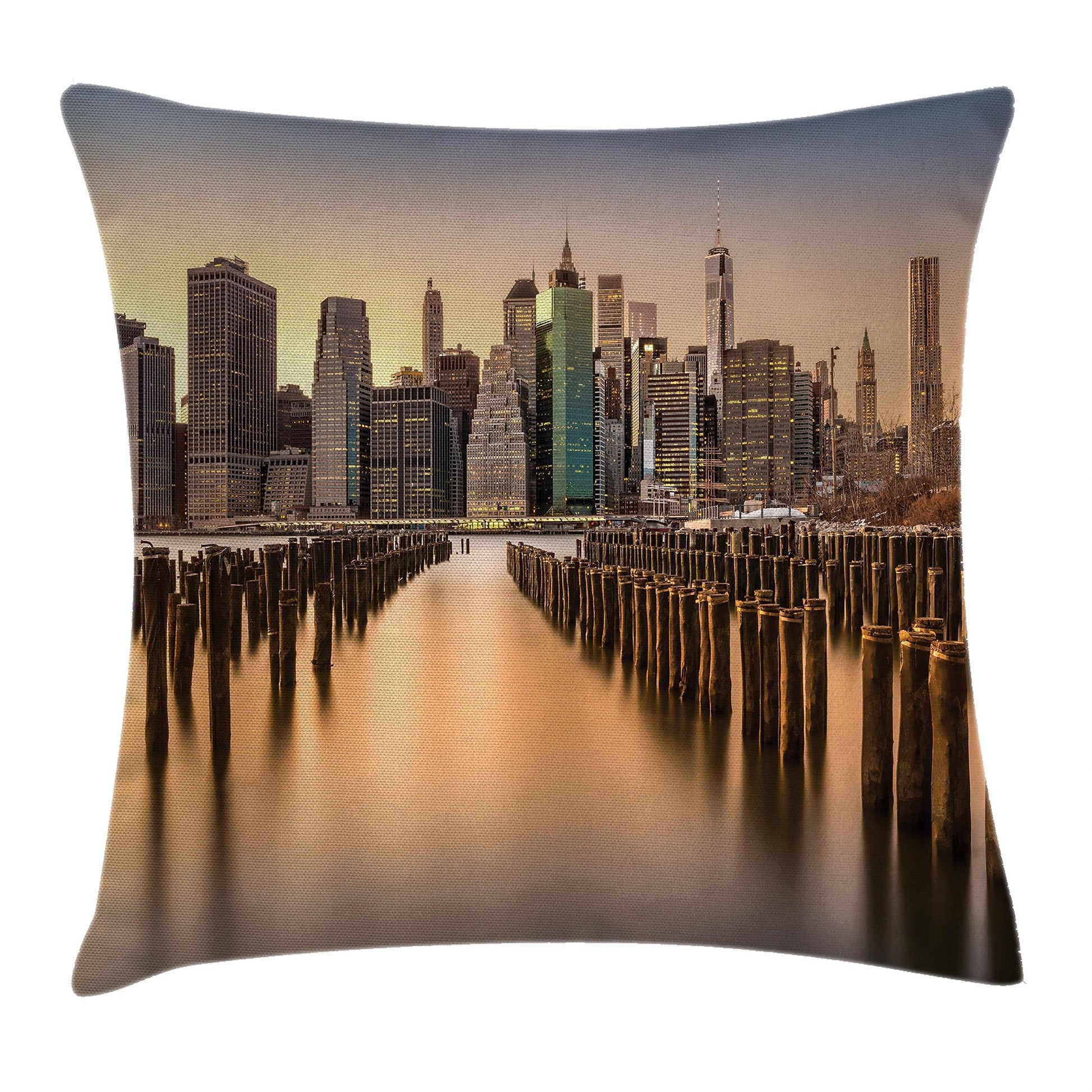 Ambesonne New York Throw Pillow Cushion Cover, Long Exposure of The Manhattan Skyline and Brooklyn Pier Urban Modern Life in NYC, Decorative Square Accent Pillow Case, 18" X 18", Pastel Yellow
