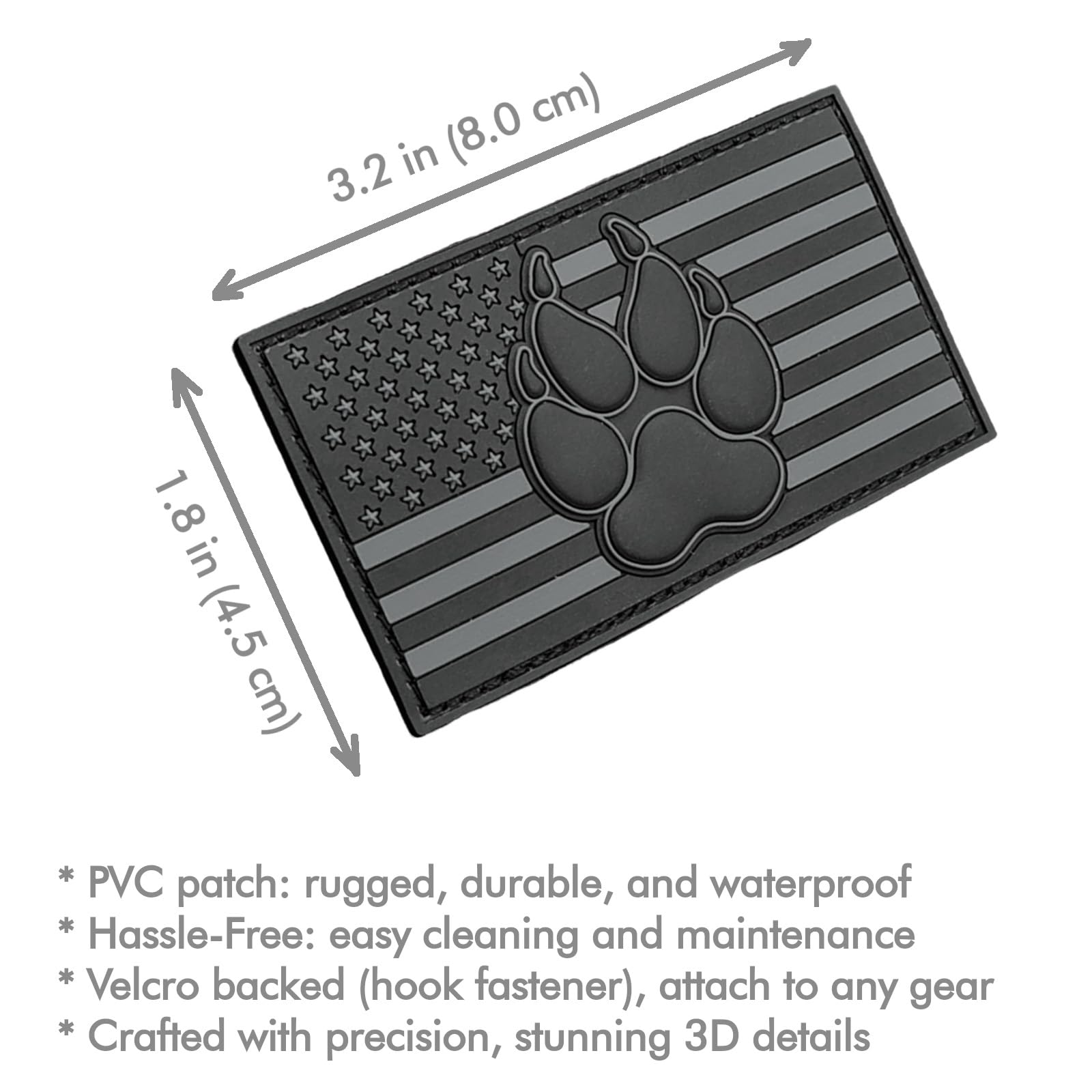 Details: Express your patriotism and love for your canine companion with our Dog Paw American Flag Patch. Designed for proud dog lovers and K9 handlers, this patch merges the symbols of a dog paw and the American flag, representing courage, loyalty, and service. It's more than just a patch; it's a tribute to the bond between handler and dog and a display of national pride. Perfect for military or law enforcement gear, wear it to honor your commitment to country and your loyal partner. Measuring approximately 3.2 x 1.8 inches (8.0 x 4.5 cm), this morale patch is sized for visual impact without overwhelming your setup. Its durable construction withstands tactical missions, outdoor adventures, and everyday wear. The flexible material allows for easy attachment to backpacks, jackets, tactical vests, and more. Whether you’re using it in the field, gearing up for a hike, preparing for duty, or expressing your unique style, this patch offers versatile, durable performance. More than just aesthetics, this patch is built for functionality and reliability. Lightweight and flexible, it’s comfortable on all your gear. The hook-and-loop backing ensures secure attachment while allowing easy removal and repositioning, giving you the flexibility to customize your setup as needed. Ideal for outdoor enthusiasts, military personnel, or anyone who values distinct and meaningful designs, this hook and loop patch is more than just an accessory—it’s a statement. Express your individuality and join those who appreciate the perfect blend of style, durability, and symbolism. Stand out with this eye-catching tactical morale patch, a constant reminder of the positive vibes and connections that define who you are.