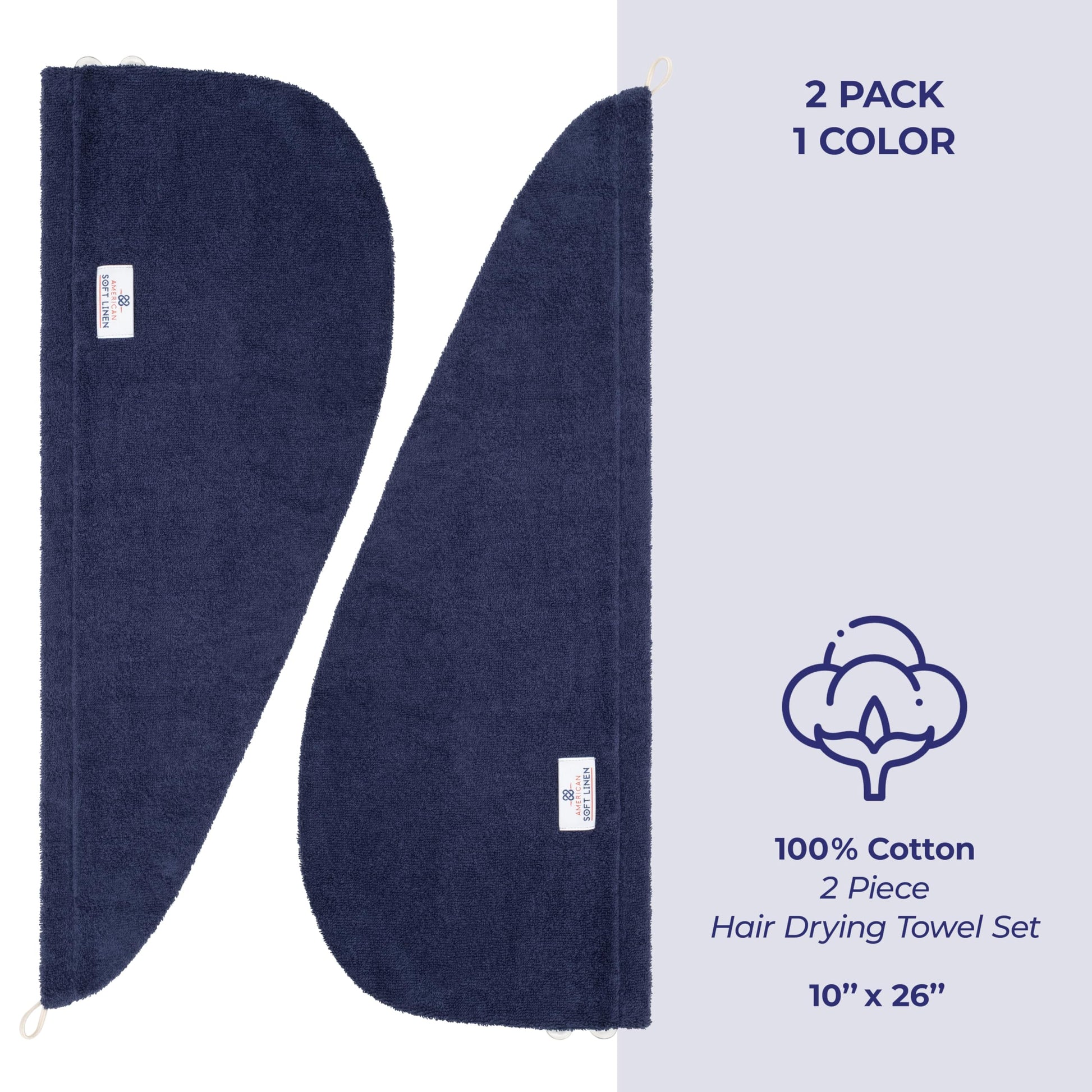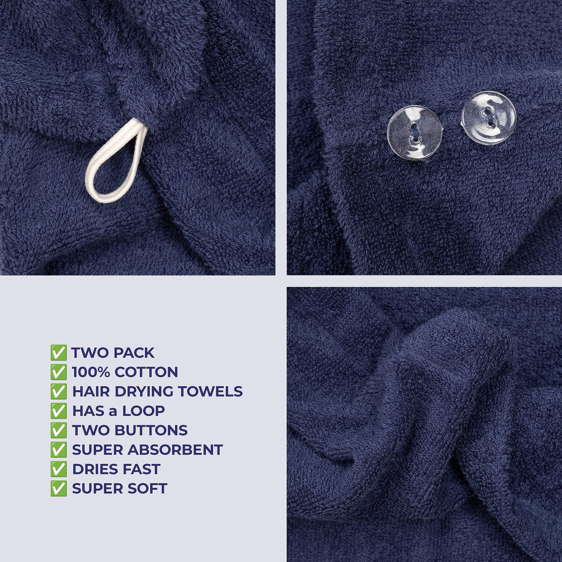 American Soft Linen 100% Cotton Hair Towels for Women, Head Towel Cap, Cotton Hair Turban Towel Wrap for Long Curly Anti Frizz Hair, Soft and Absorbent Cotton Hair Towels 2 Pack, Navy Blue
