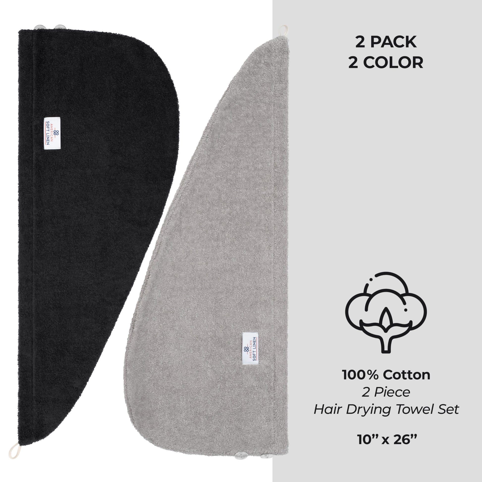 American Soft Linen 100% Cotton Hair Towels for Women, Head Towel Cap, Cotton Hair Turban Towel Wrap, Soft and Absorbent 2 Pack, Black-Light Gray