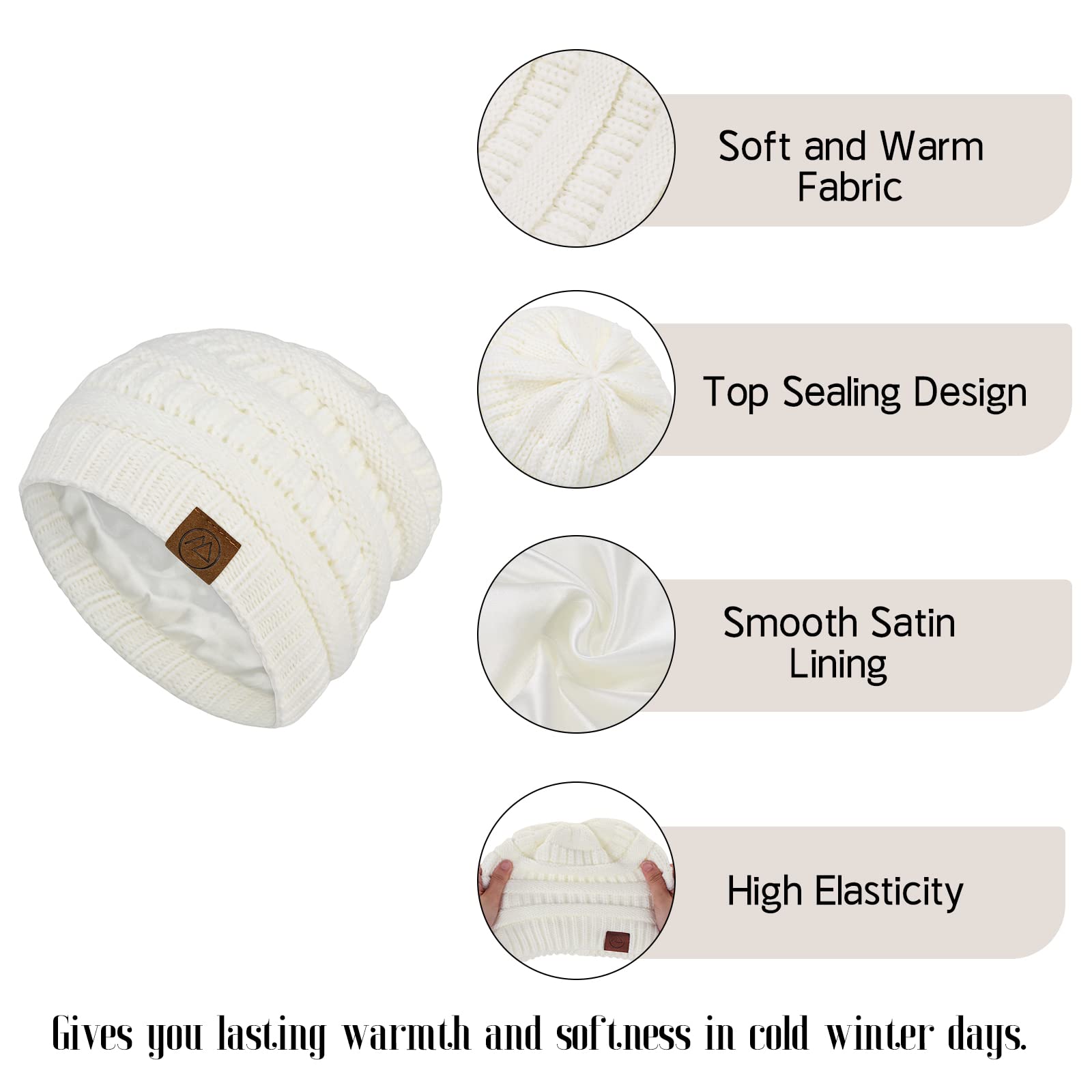 ăSoft Satin Liningă: Satin is perfect for protecting hair because it doesn't absorb as much moisture or cause as much friction as other materials, like wool and cotton. In addition, Our hair is vulnerable to damage every time we step out into the wind, sun, and cold. Wearing our satin lined beanie to provided extra care for your head and ears! Besides, special customized satin lined design makes this silk lined beanie very easy to wear and take off, and it won't mess up your hairstyle. -