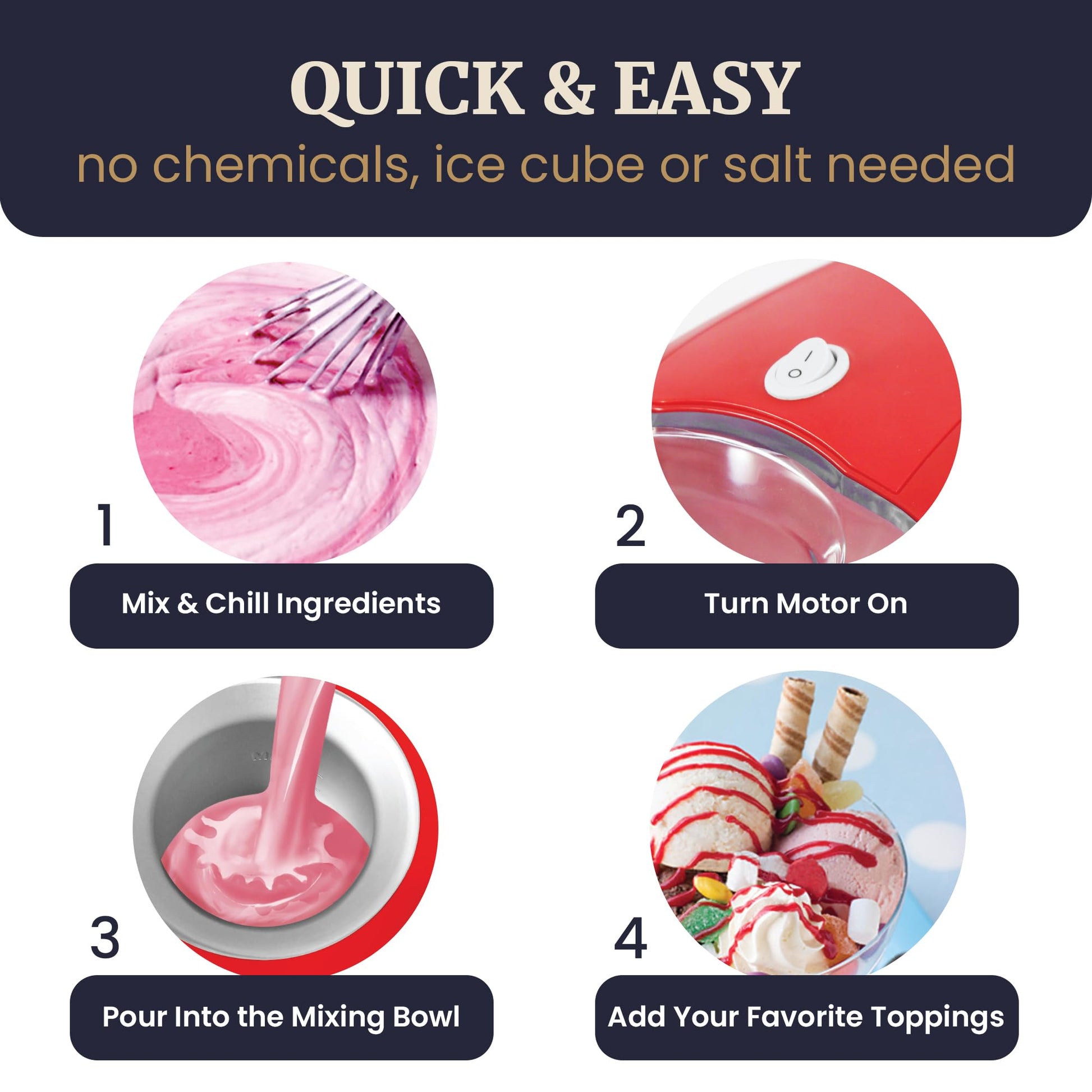 - Quick & Easy to Use: The ice cream and dessert maker is simple to use. Simply freeze the bowl overnight, then add the ingredient mixture into the machine, push a button and you'll have a tasty dessert in a short time.