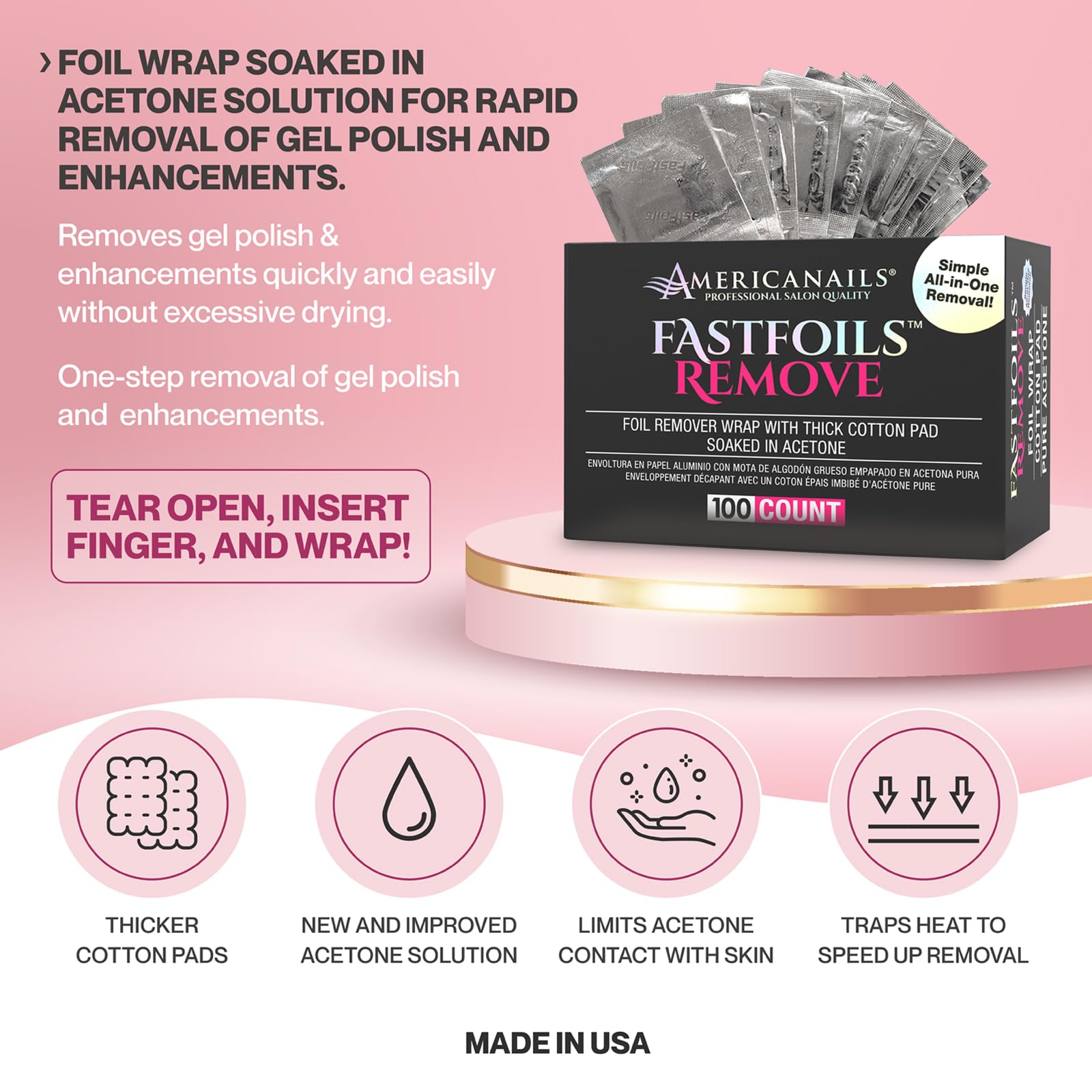 - Fast & Easy: The most convenient & efficient way of removing nail polish, gel polish, gel nails, acrylic nails, dip nails. Americanails FastFoils has 3 components: foil wrap, thick cotton pad & pure acetone. Simply tear, insert, and wrap!