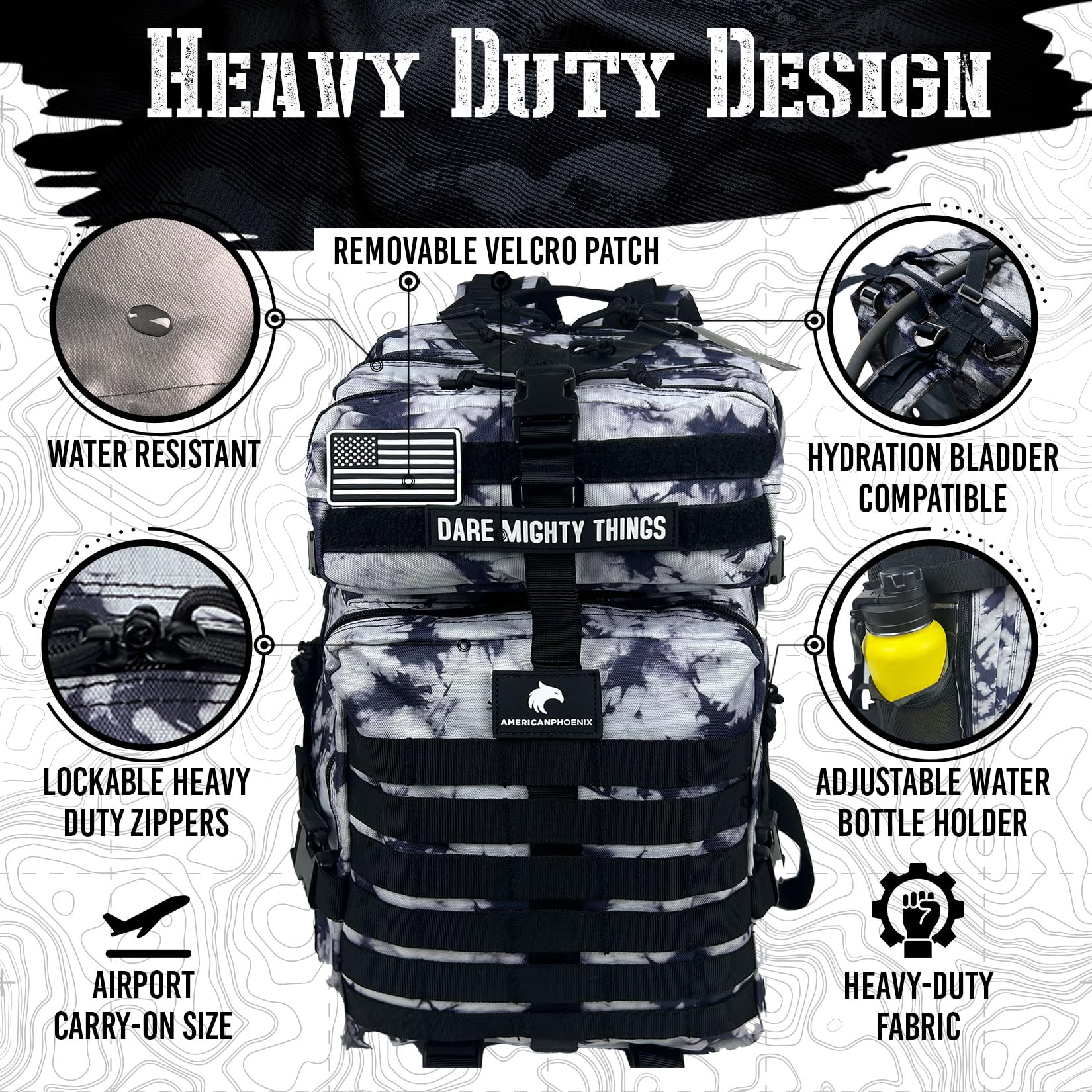 - 🇺🇸 AMERICAN BRAND: AMERICANPHOENIX backpacks come with a one-year full warranty. Each backpack features a removable velcro patch of the American flag and our motto 'Dare Mighty Things,' inspired by President Theodore Roosevelt's 1899 'Strenuous Life' speech. Our products have been purposefully built to deliver reliable performance in unreliable conditions.
