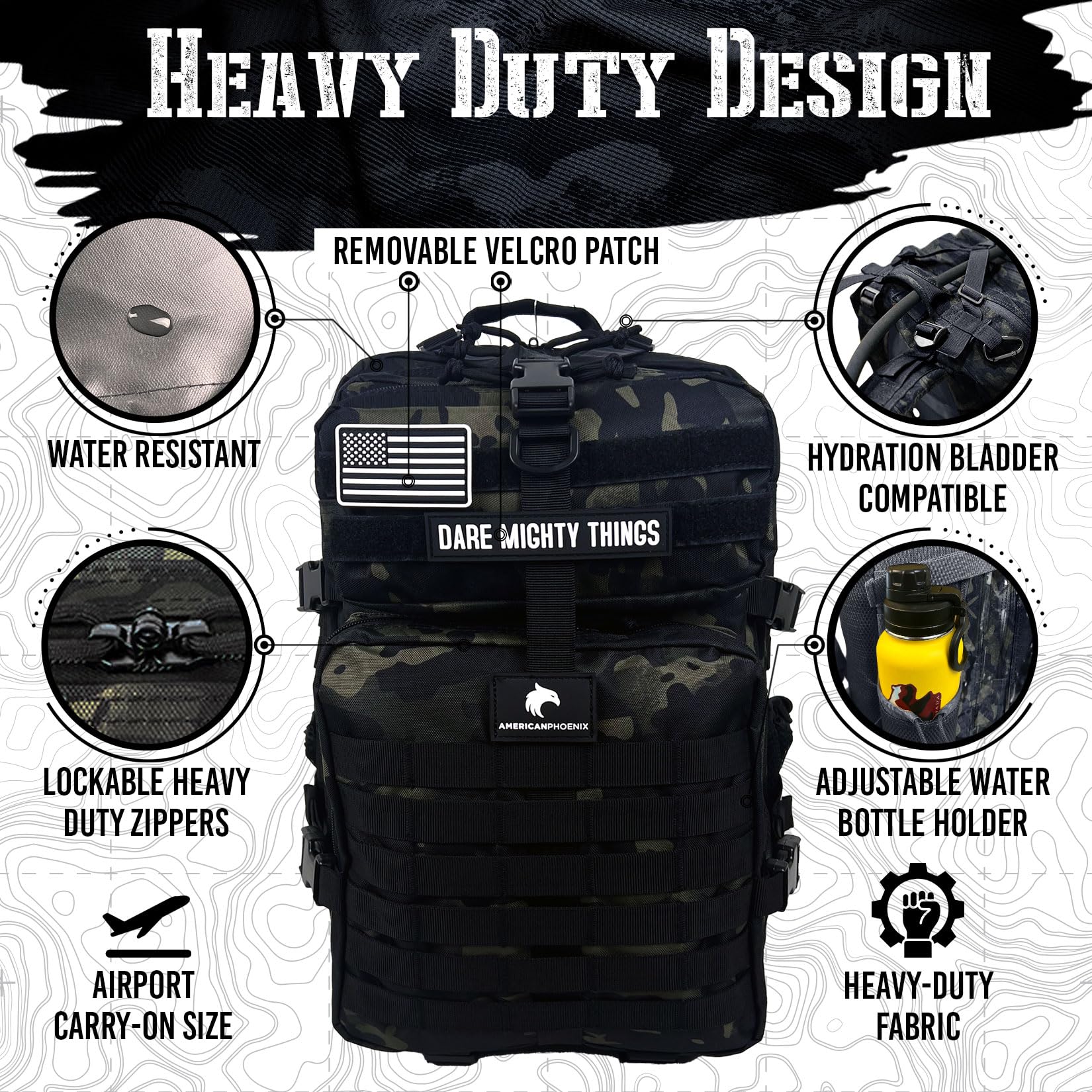 - 🇺🇸 AMERICAN BRAND: AMERICANPHOENIX backpacks come with a one-year full warranty. Each backpack features a removable velcro patch of the American flag and our motto 'Dare Mighty Things,' inspired by President Theodore Roosevelt's 1899 'Strenuous Life' speech. Our products have been purposefully built to deliver reliable performance in unreliable conditions.