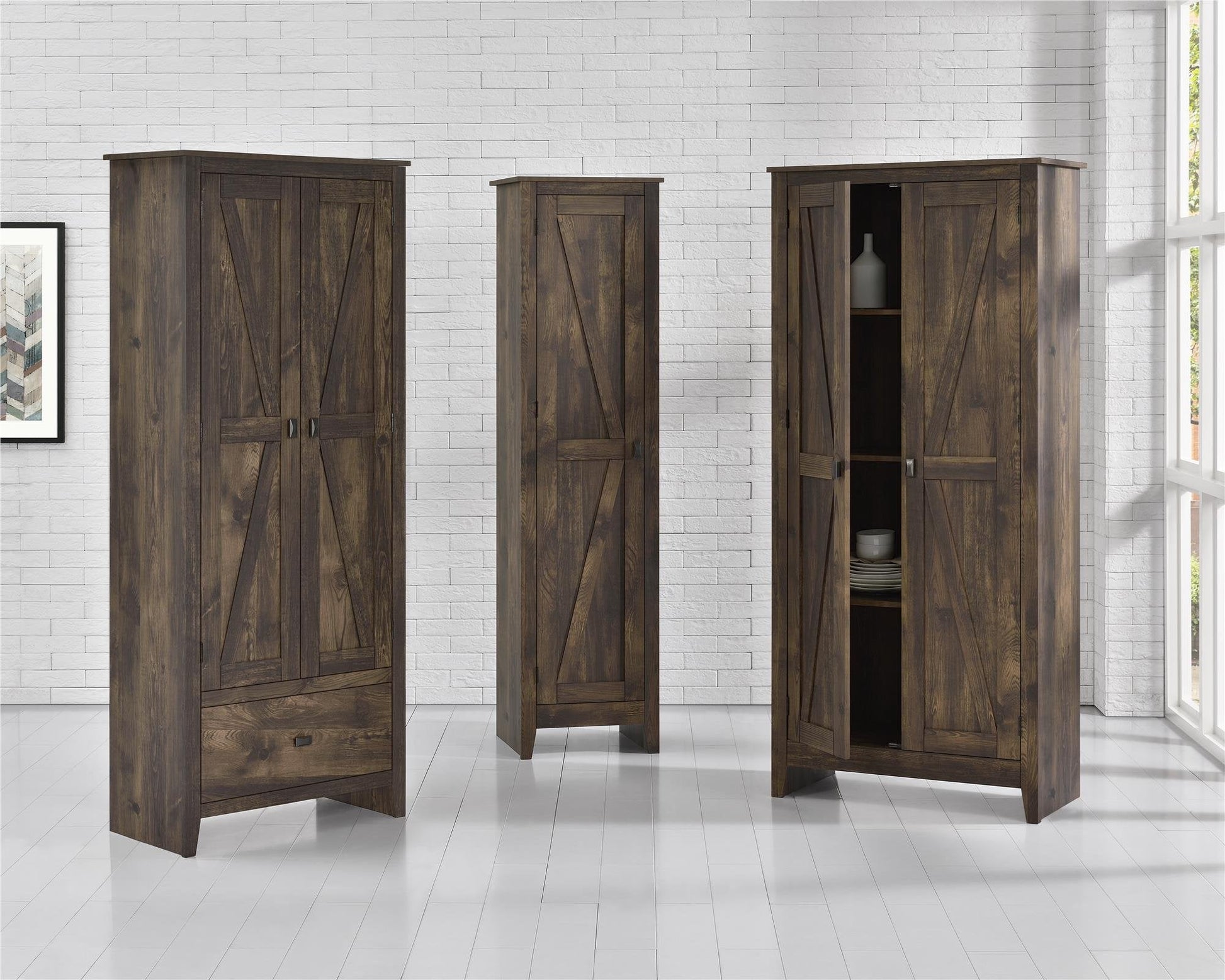 - This Farmington Storage Cabinet features a farmhouse style including two doors and four shelves with a weathered like appearance, it's suitable as a wood storage cabinet for living rooms