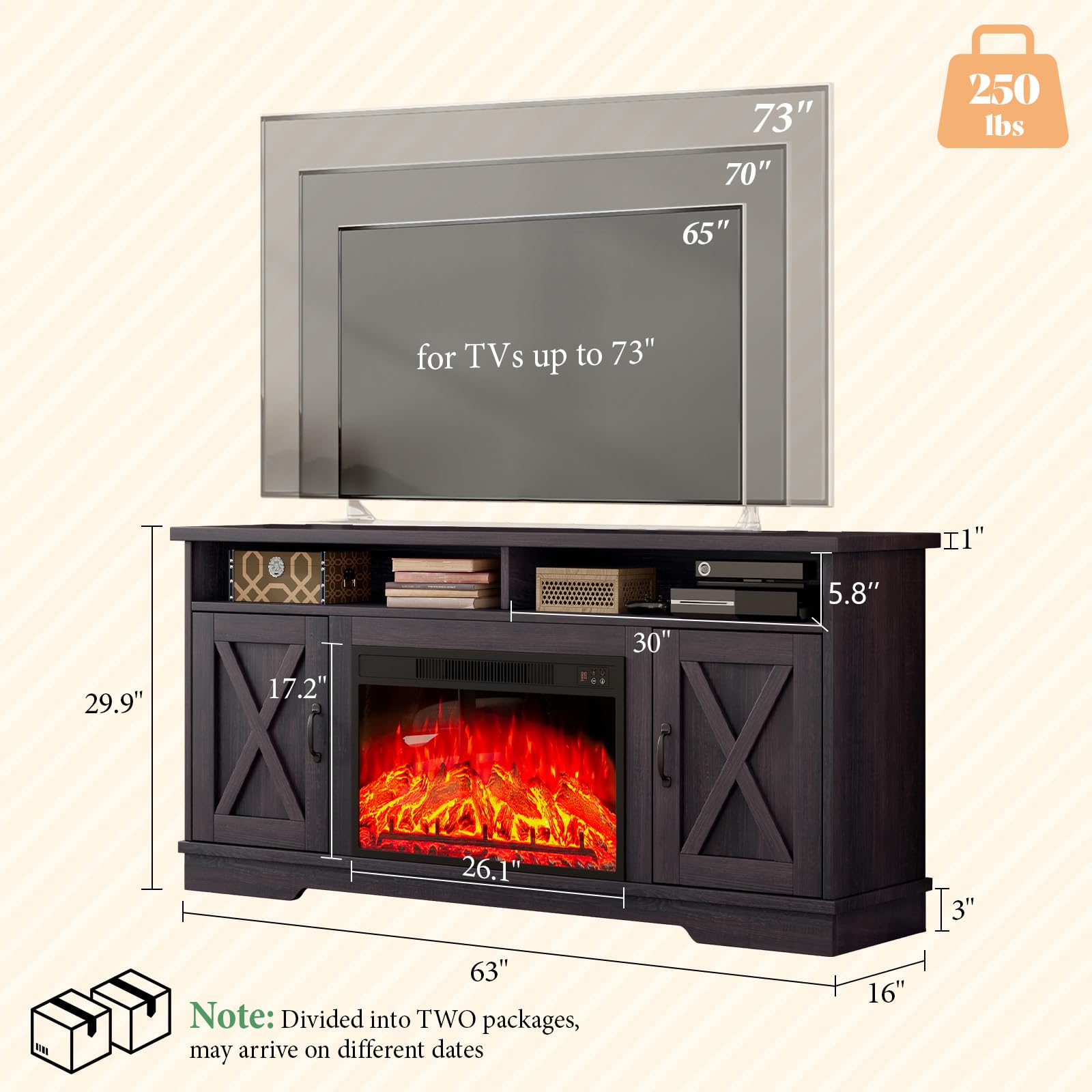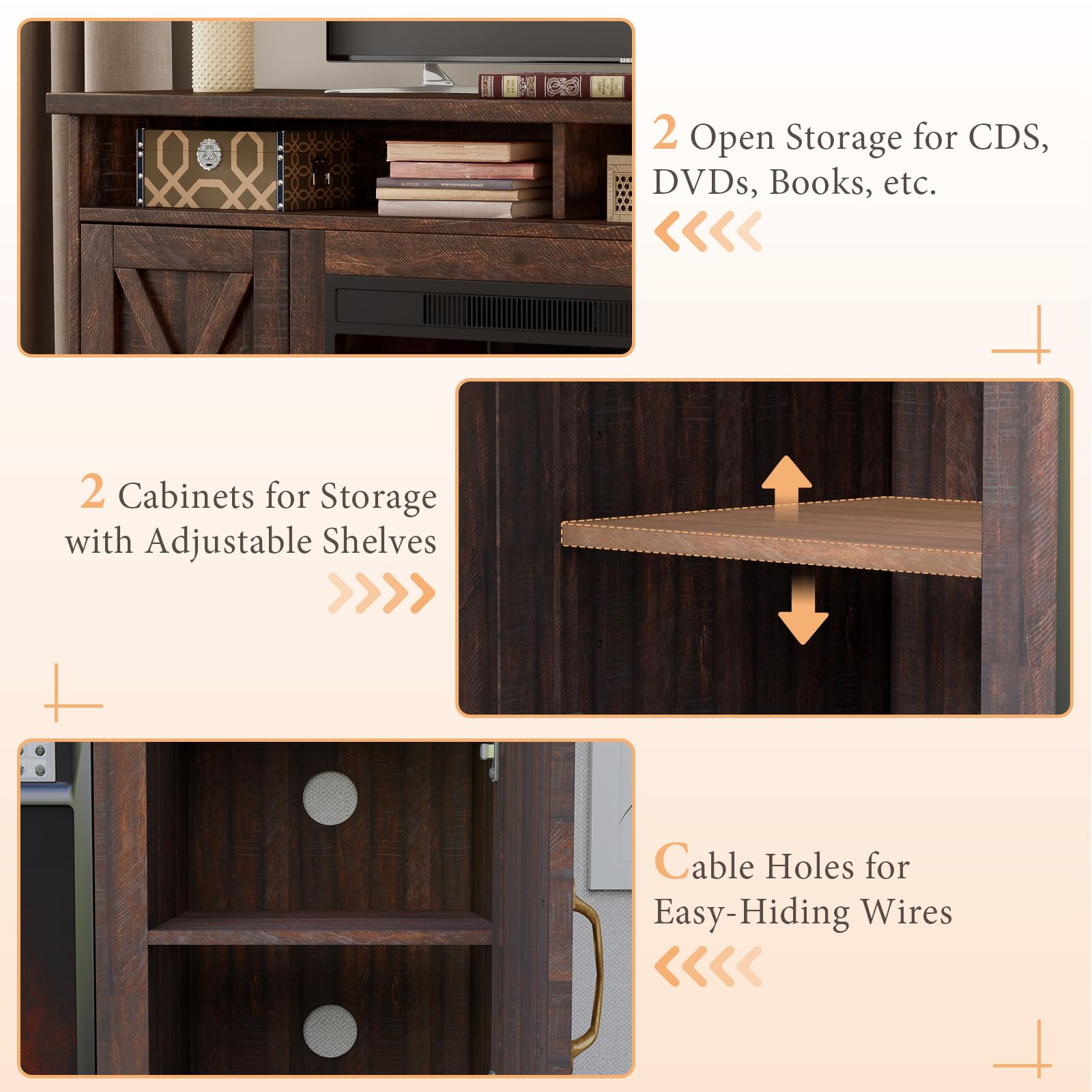 - Ample Storage Space: Open shelves and interior adjustable shelves for flexible custom storage, several cable management holes easy-hiding wires. Overall size:63' W x 30' H x 16'D, for TVs up to 73'
