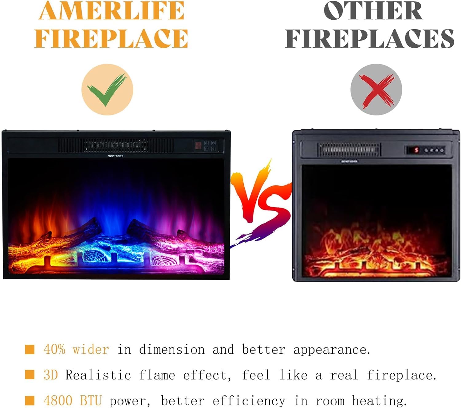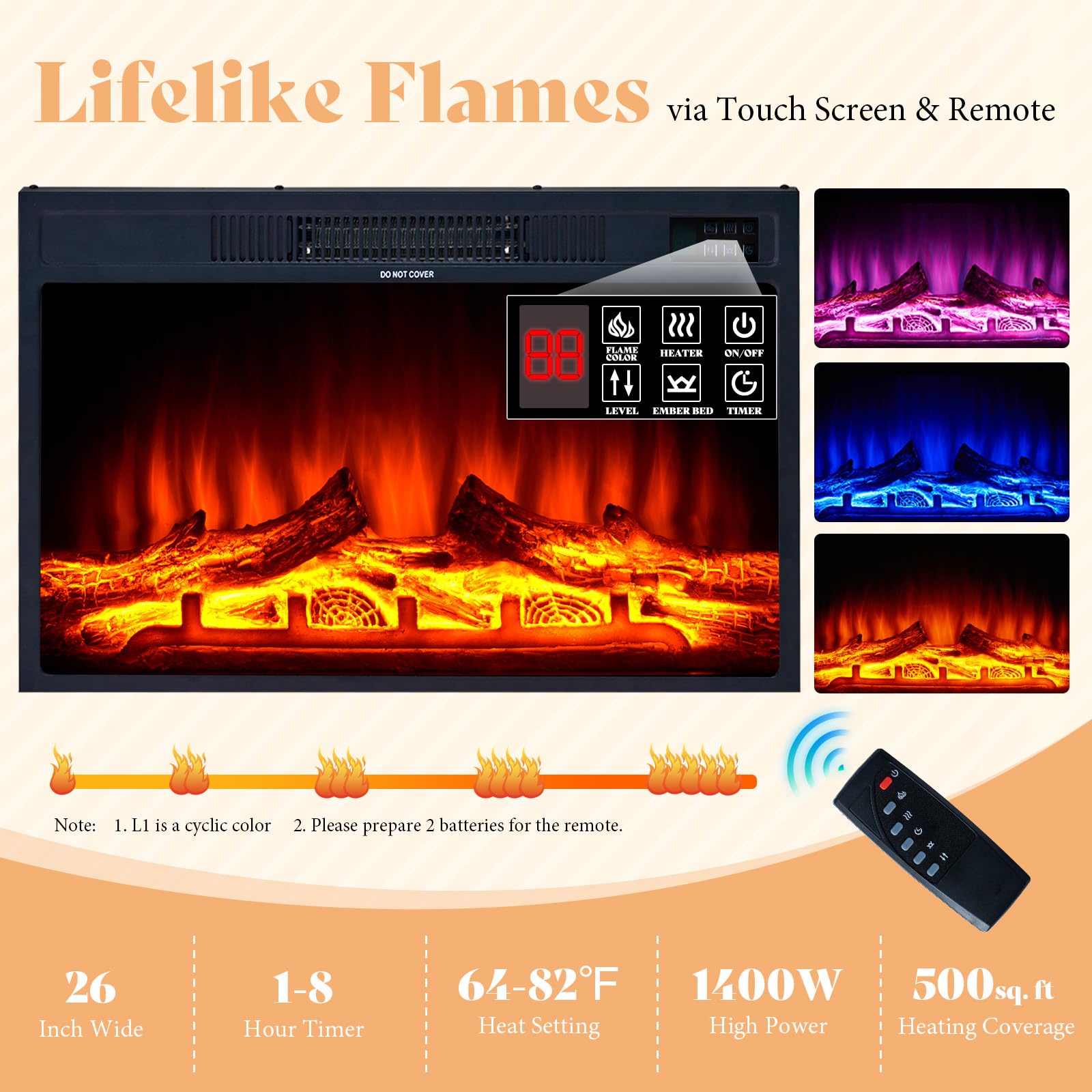 - 26' Wide Fireplace: Simulated real logs, ash layers, and realistic flame to simulate the combustion process of natural flames. Timer and temperature adjustment, control by touch screen & remote