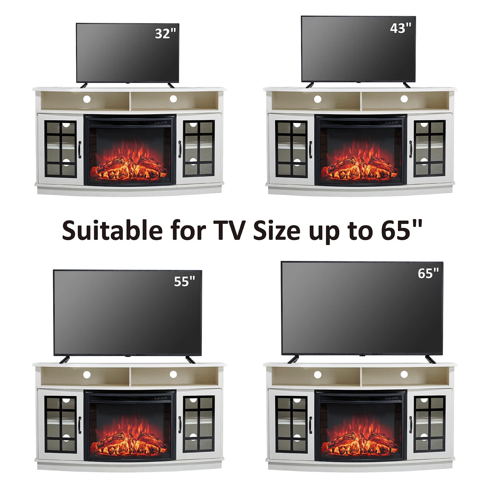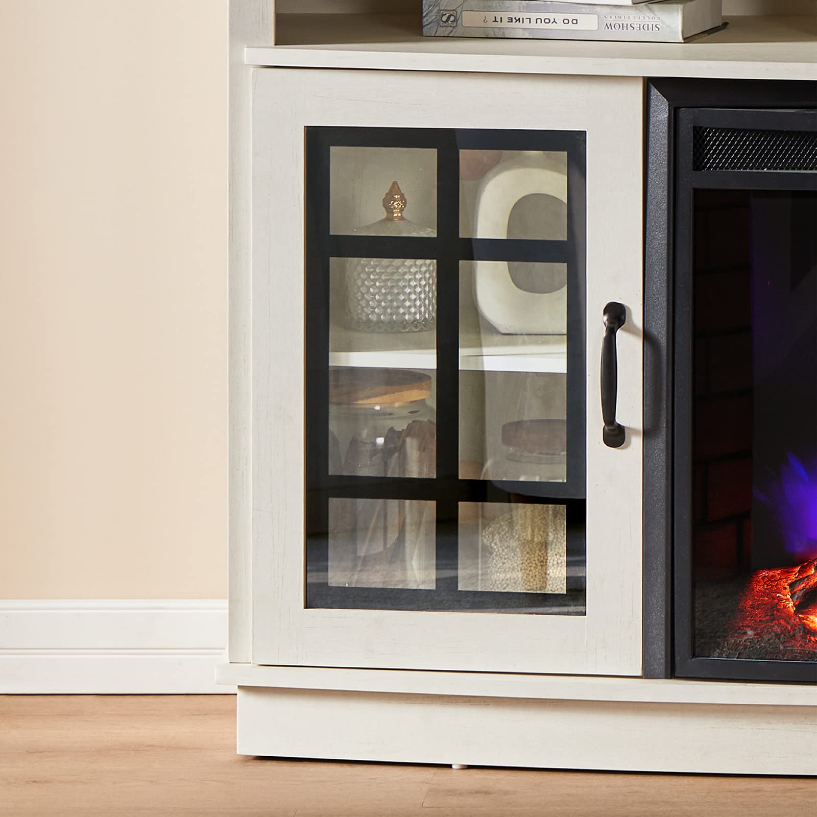 AMERLIFE Curved Fireplace TV Stand with 26'' Electric Fireplace, Media Entertainment Center Farmhouse Glass Door Storage Cabinet, Open Shelve Console Table for TVs up to 65'', Distressed White