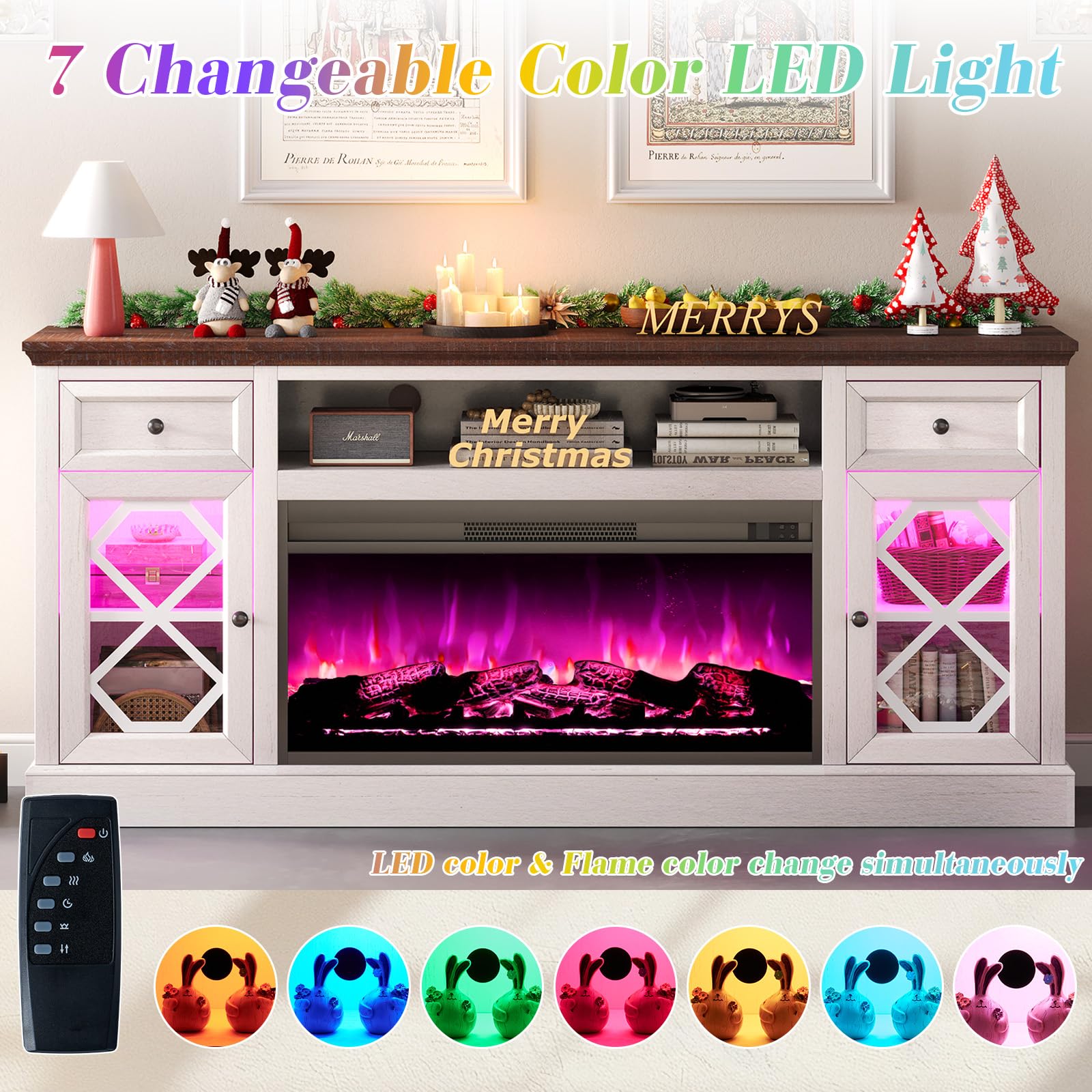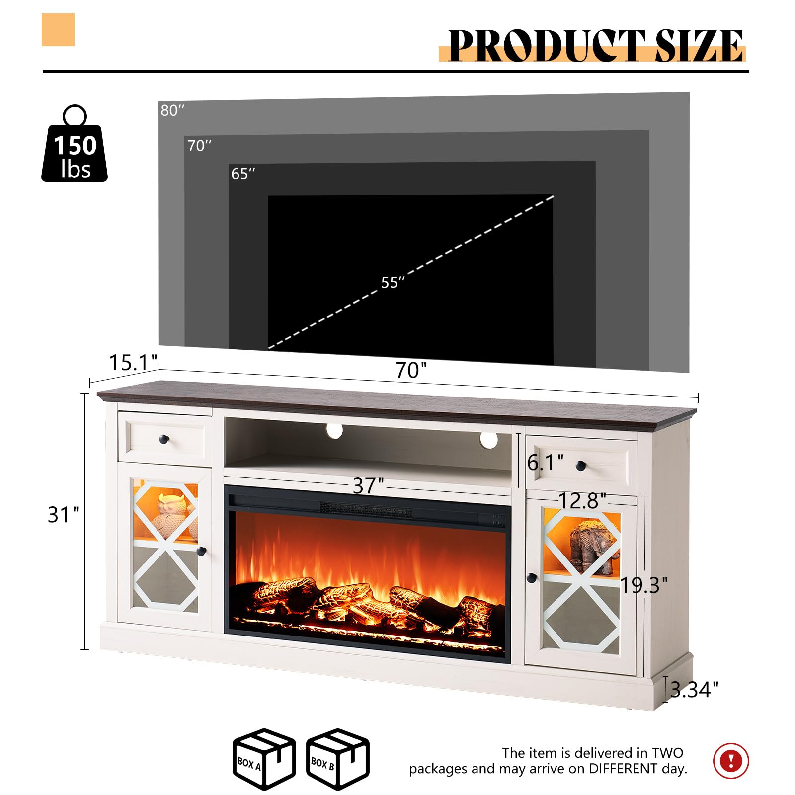 - Large Fireplace TV Stand - 70' Wide tabletop in fireplace console accommodates TVs up to 80 inches. Combining 7-color flame with 7-color LED enhances visual enjoyment, creating an entertainment space filled with storage & stylish.