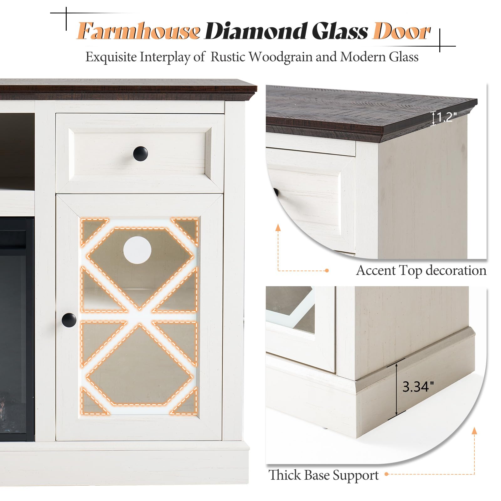 - Farmhouse TV Console - Highboy cabinet features classic woodgrain finish and 3' thick bottom platform. Glass diamond pattern door design adds a modern touch to traditional functionality. Table top weight capacity: 150 lbs.