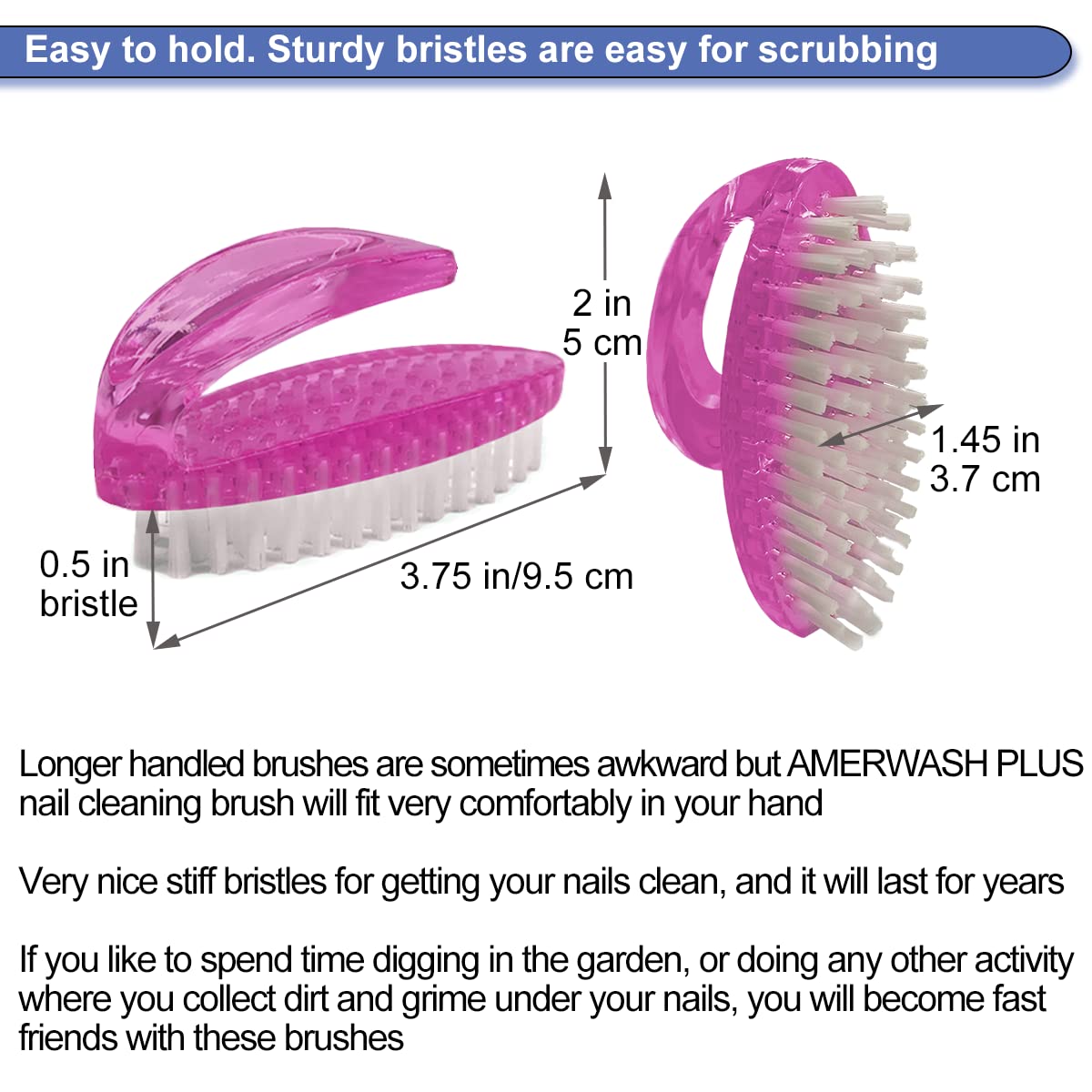 - CUTE & STURDY - Our fingernail cleaning brushes feature an open handle design that is both charming and functional. They are easy to grip or hang, ensuring they stay securely in hand without slipping. Built with sturdy, stiff bristles, these finger nail scrub brushes offer superior durability compared to the softer ones often found in stores meant for manicures. They are particularly suited for gardeners and mechanics, effectively cleaning under nails after gardening or working in the garages.