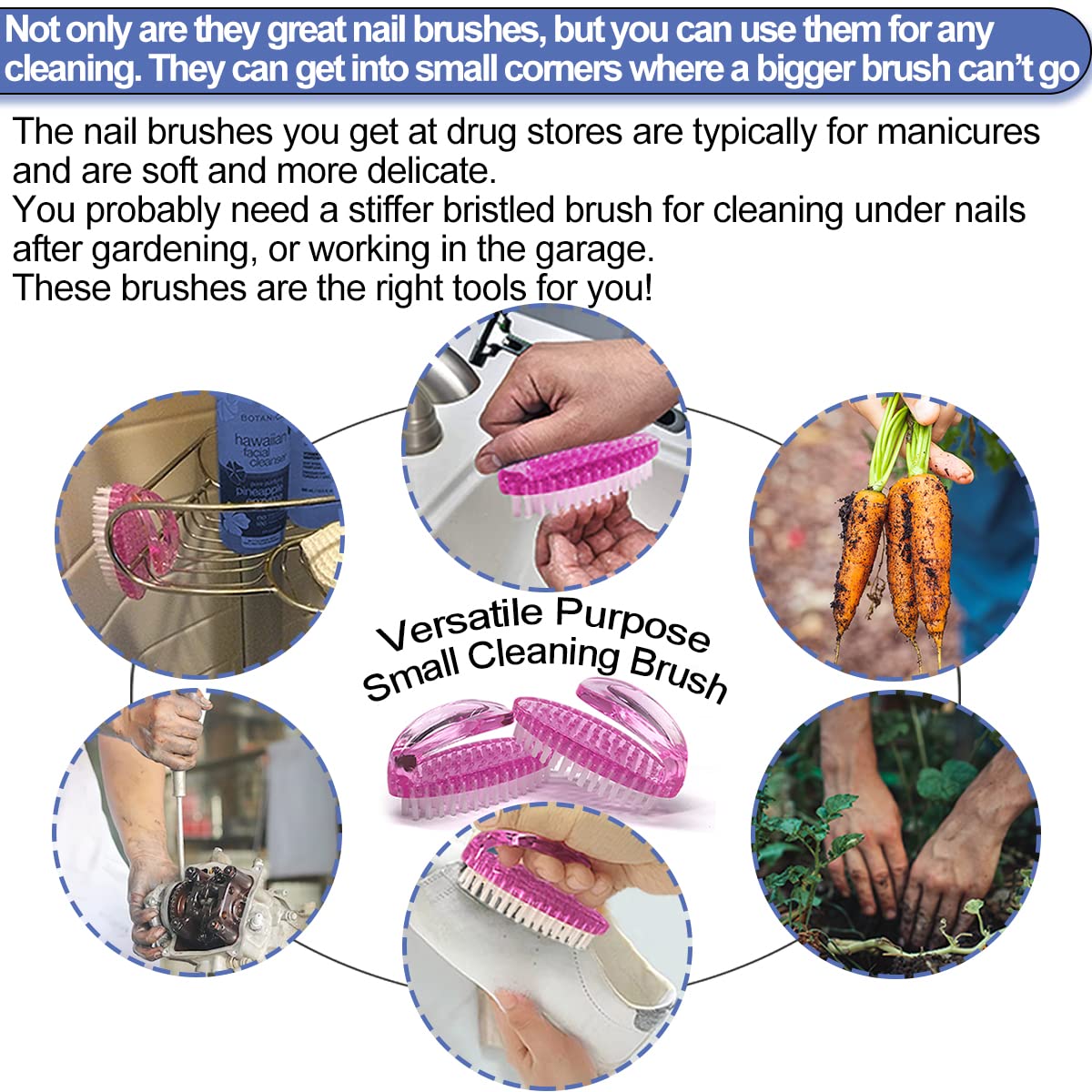 - STIFF BRISTLES NAIL BRUSH FOR CLEANING - The nail brushes for cleaning fingernails feature stiff yet flexible nylon bristles that are effective for cleaning nails and hands after handling greasy projects. It easily removes grime from hands, fingertips, and feet. These stiff nail brushes are versatile, effortlessly tackling stubborn stains and dirt from crevices or narrow spaces, and they are great for cleaning vegetables as well in the kitchen.