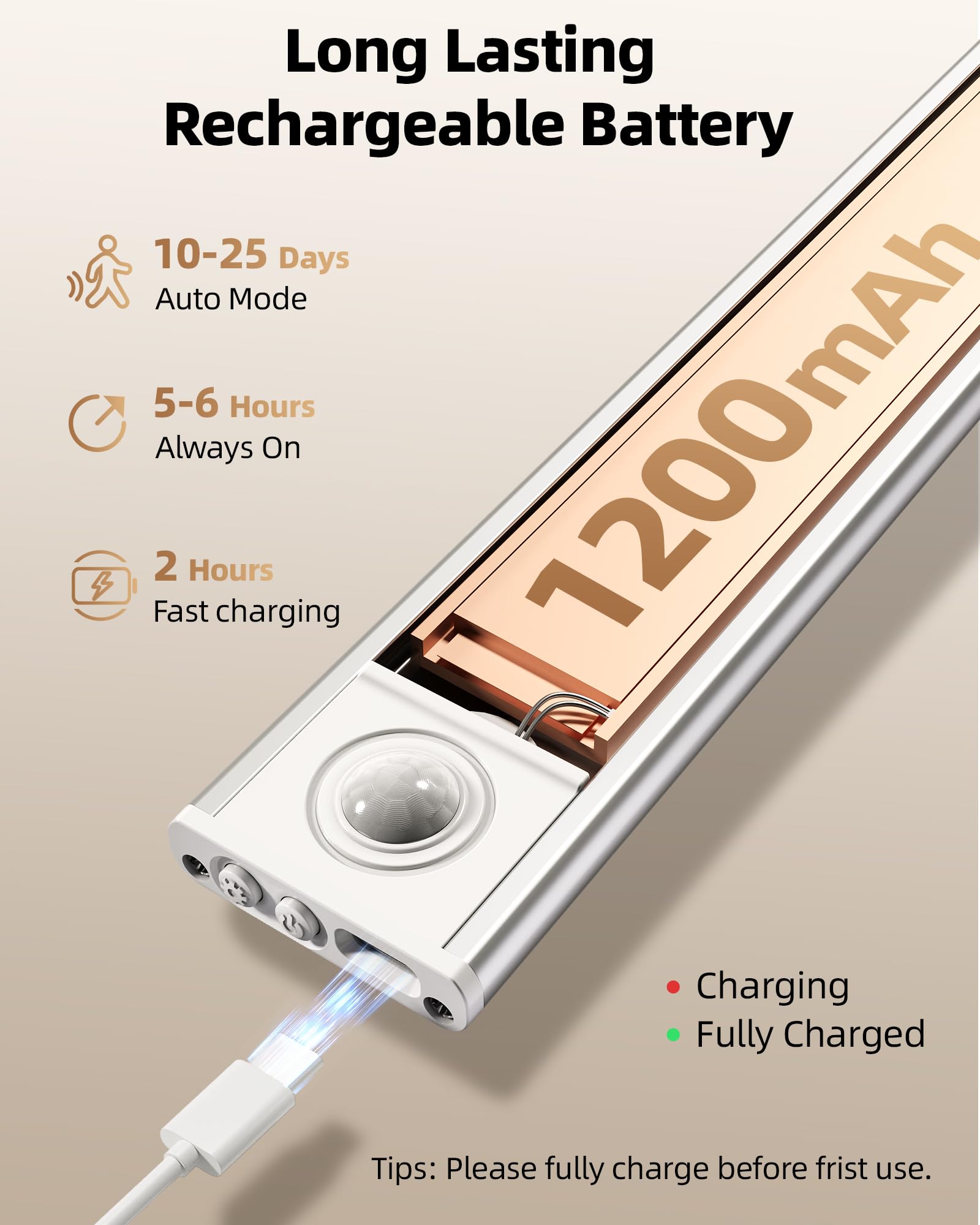 - 4.Rechargeable Cabinet Lights Wireless:The under cabinet lighting closet lights built in 1200mAh rechargeable battery operated.In Always-On Mode, it can work continuously for 5-6 hours(Max Brightness) ; In auto mode, the battery life for continuous lighting is up to 10-25 days (depending on usage frequency) It takes 2 hours to fully charge. It can charged by any USB devices.