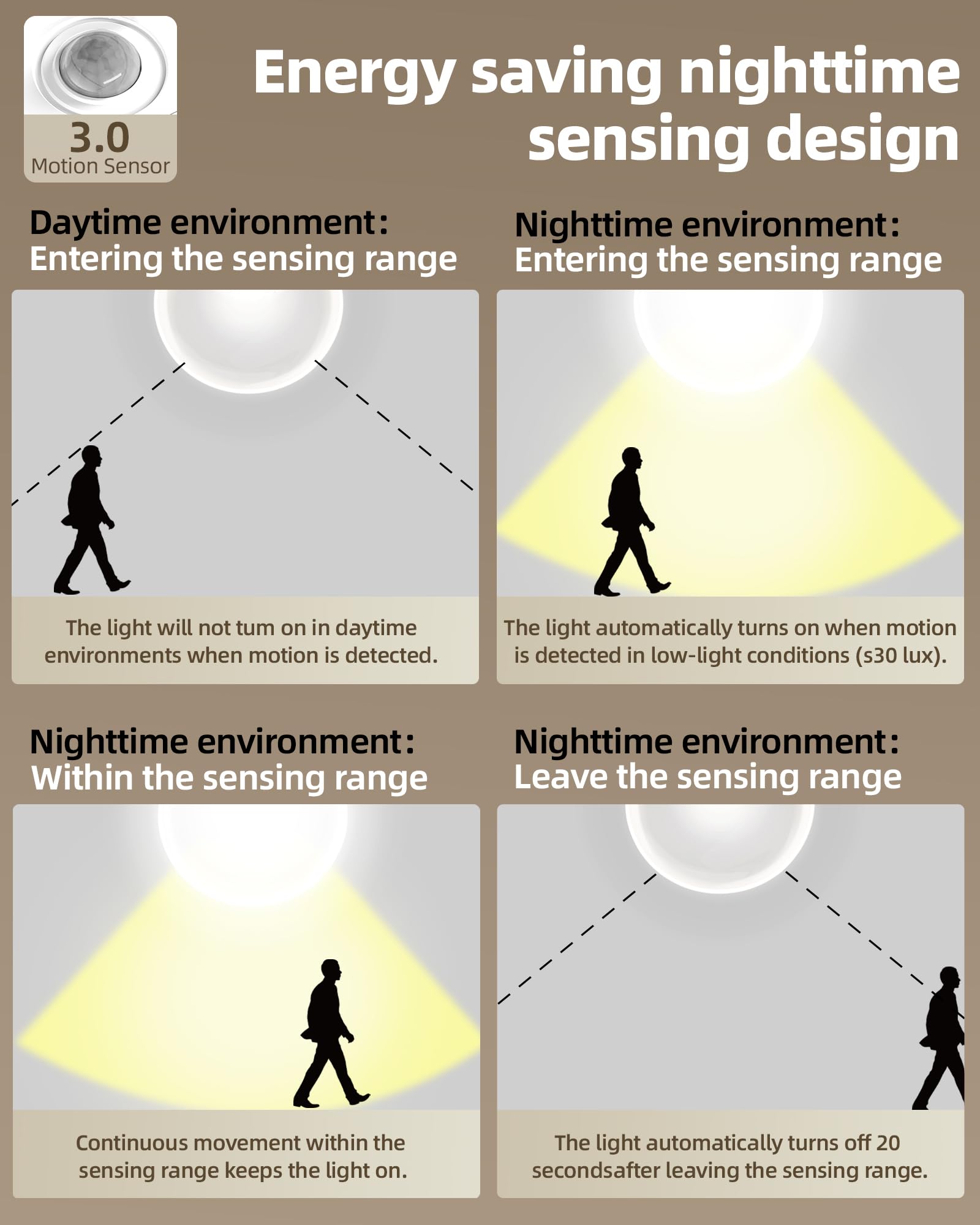 - 1.Motion Activated Cabinet Lights:The rechargeable under cabinet lighting is equipped with motion sensing mode. In Auto mode and dark environment (20lux), When motion is detected within a range of 10 ft/120°, The Motion Sensor Light Indoor automatically turns on and turns off after 20 seconds (Auto mode is only suitable for dark environments,ensuring efficient energy use)