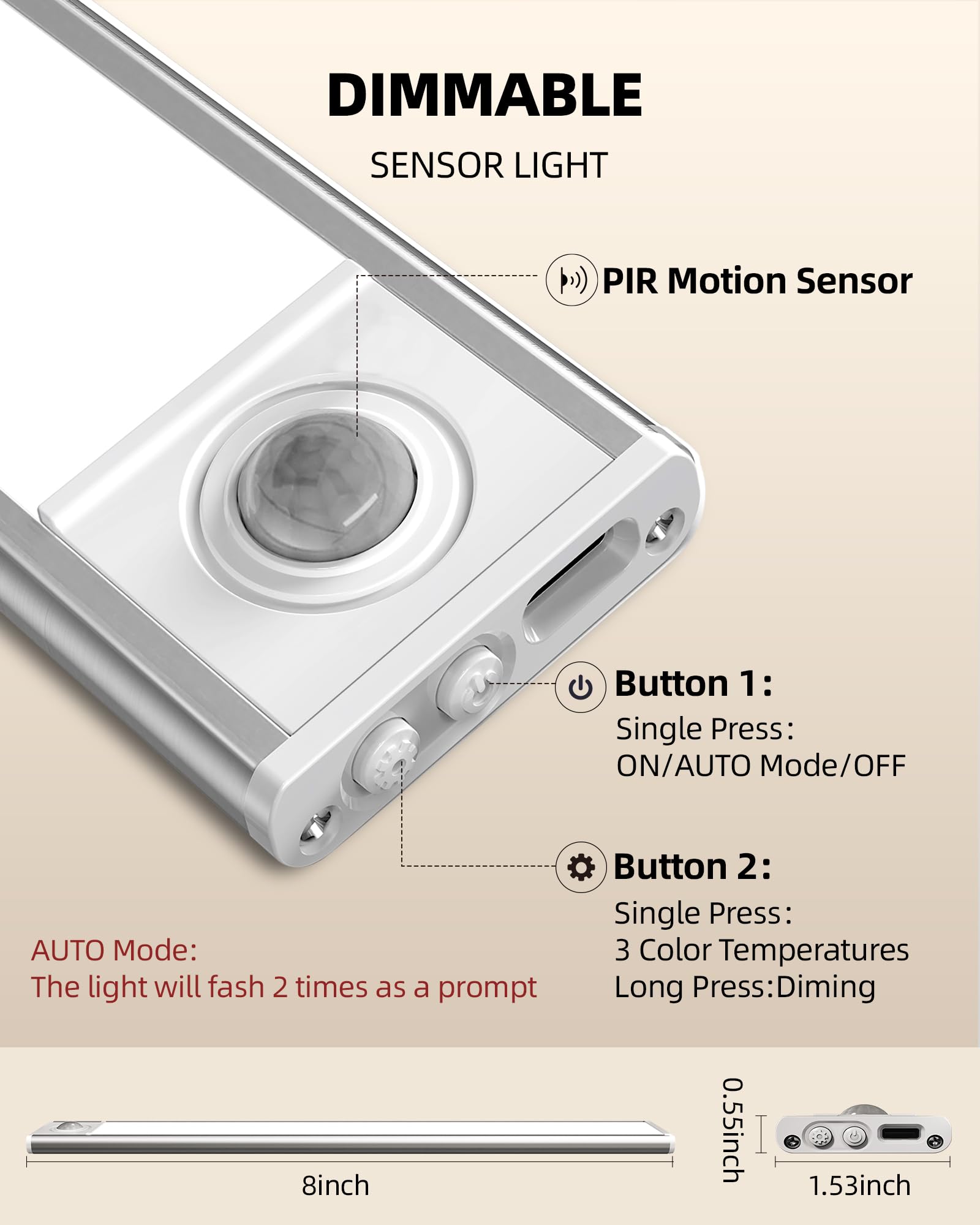 - 2.3 Color Temps & Dimmable Under Cabinet Lighting: Tailor your lighting environment with our Motion Sensor Light Indoor that feature three adjustable color temperatures: warm white (3000k), natural light(4500k), and cool white(6500k), Dimming functionality provides added flexibility.It supports stepless dimming from 10% to 100% and has memory function. It can be used in reading, camping, flashlight and as emergency lights