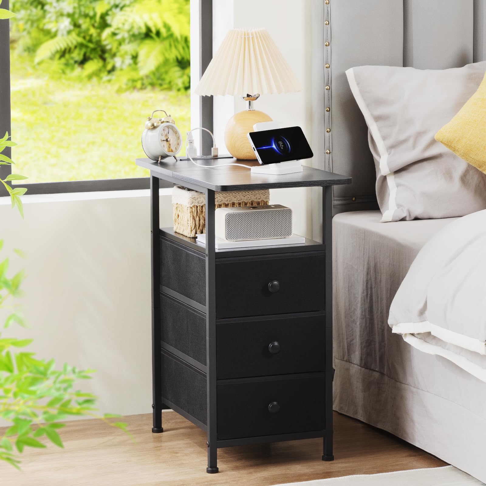 AMHANCIBLE End Tables Living Room with Charging Station, Narrow Side Table with USB Ports and Outlets, Slim Nightstand with 3 Fabric Drawers for Bedroom, Small Space, Black, HETN013BK-1