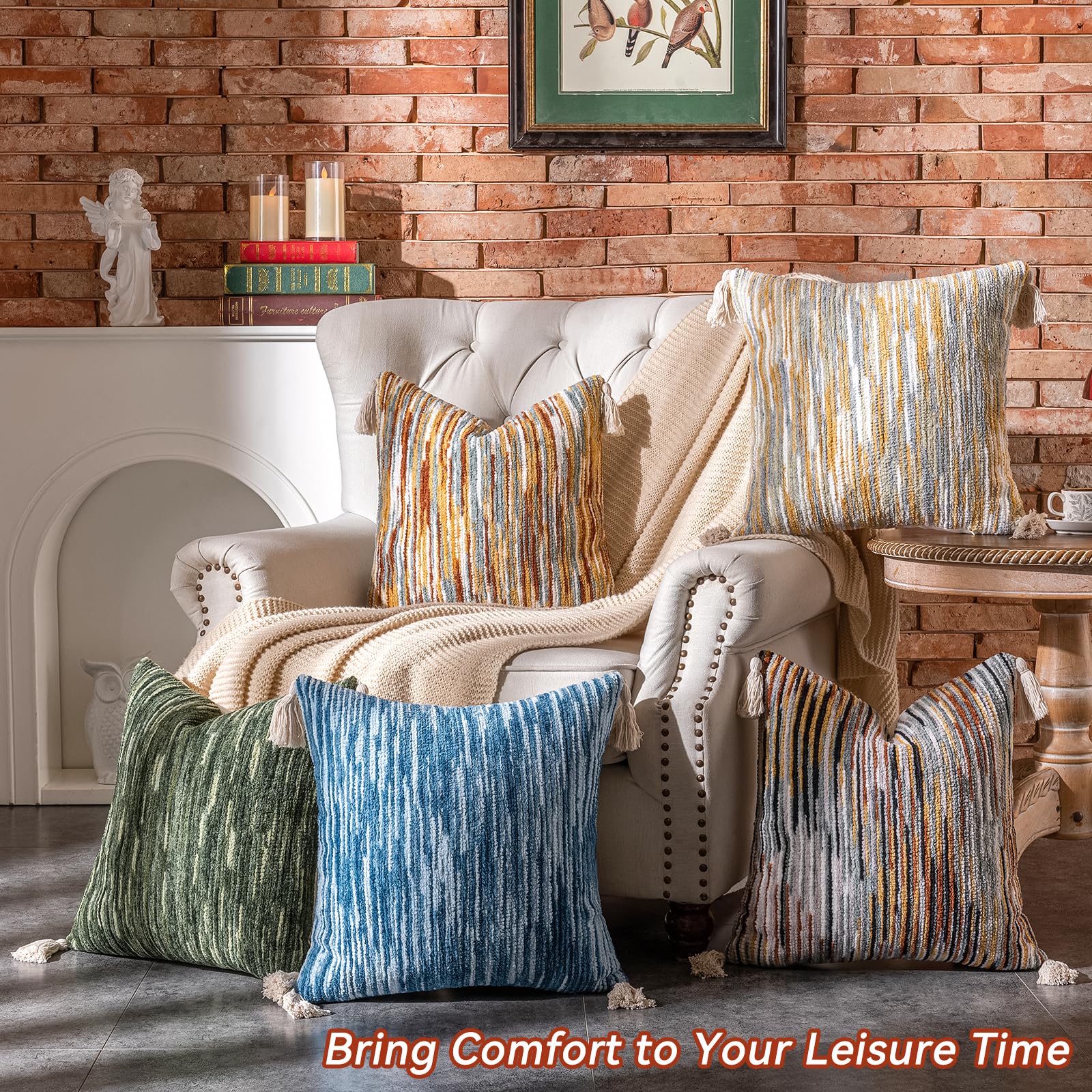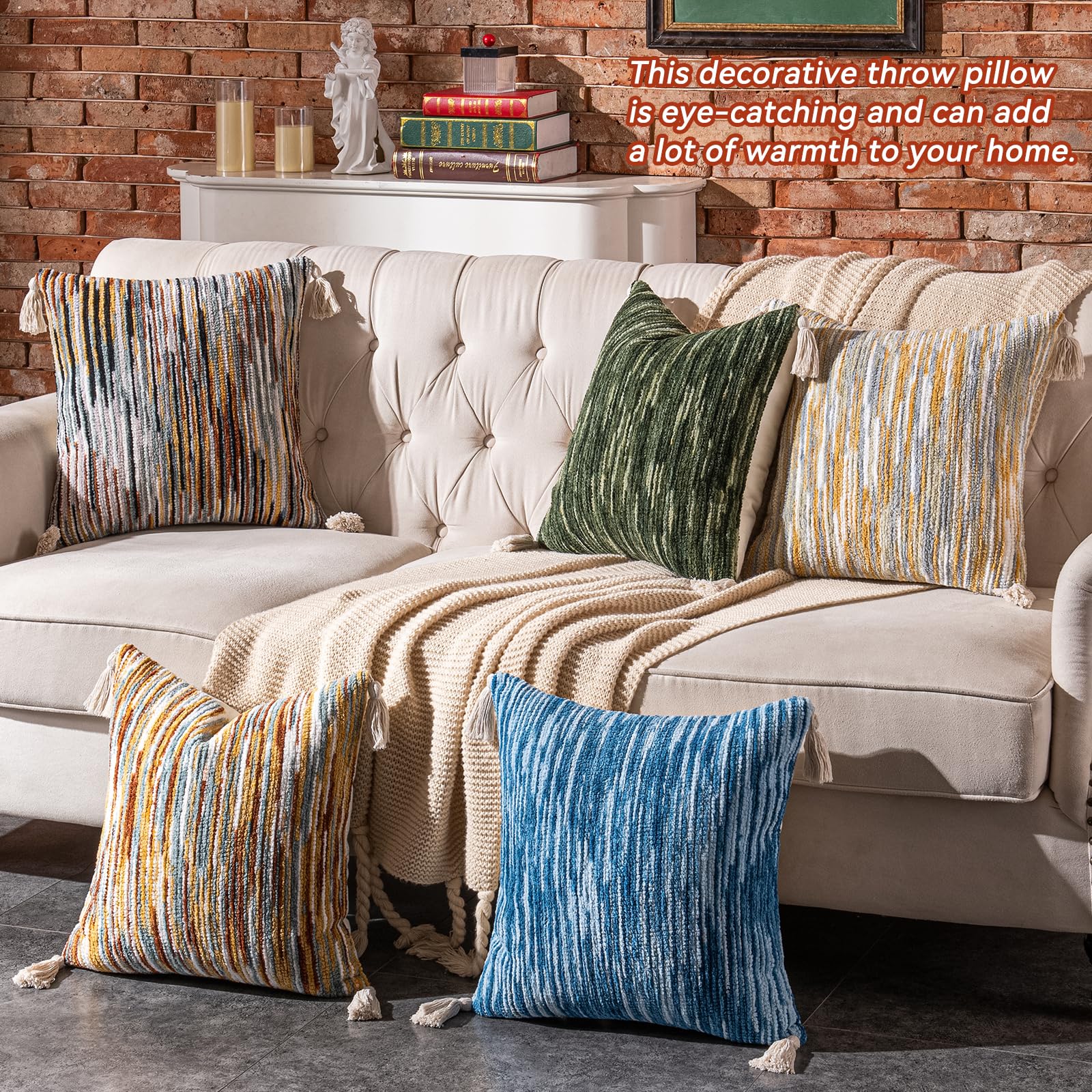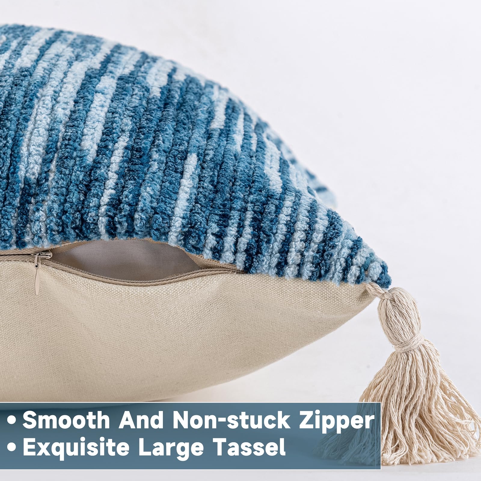 - Fabric and Workmanship:The textured pillow cover features chenille on the front, and cotton on the back.Handcrafted four cornered tassels do not fall off easily. Sturdy stitching and careful hemming make the stripe cushion covers durable and exquisite