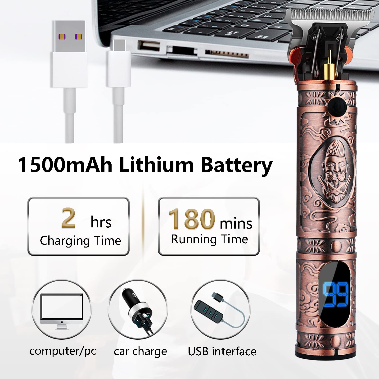 - 【Cordless USB Rechargeable Design】 - 1500mAh Lithium-ion battery delivers over 180 minutes of nonstop run time; charges in just 2 hour. The USB cable can compatible with any USB charger interface .You can walk away from the charger while using maximum mobility and convenience.