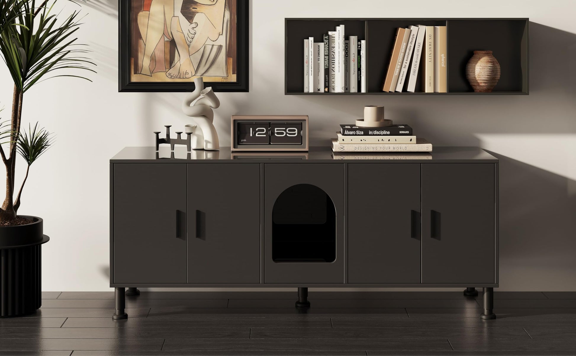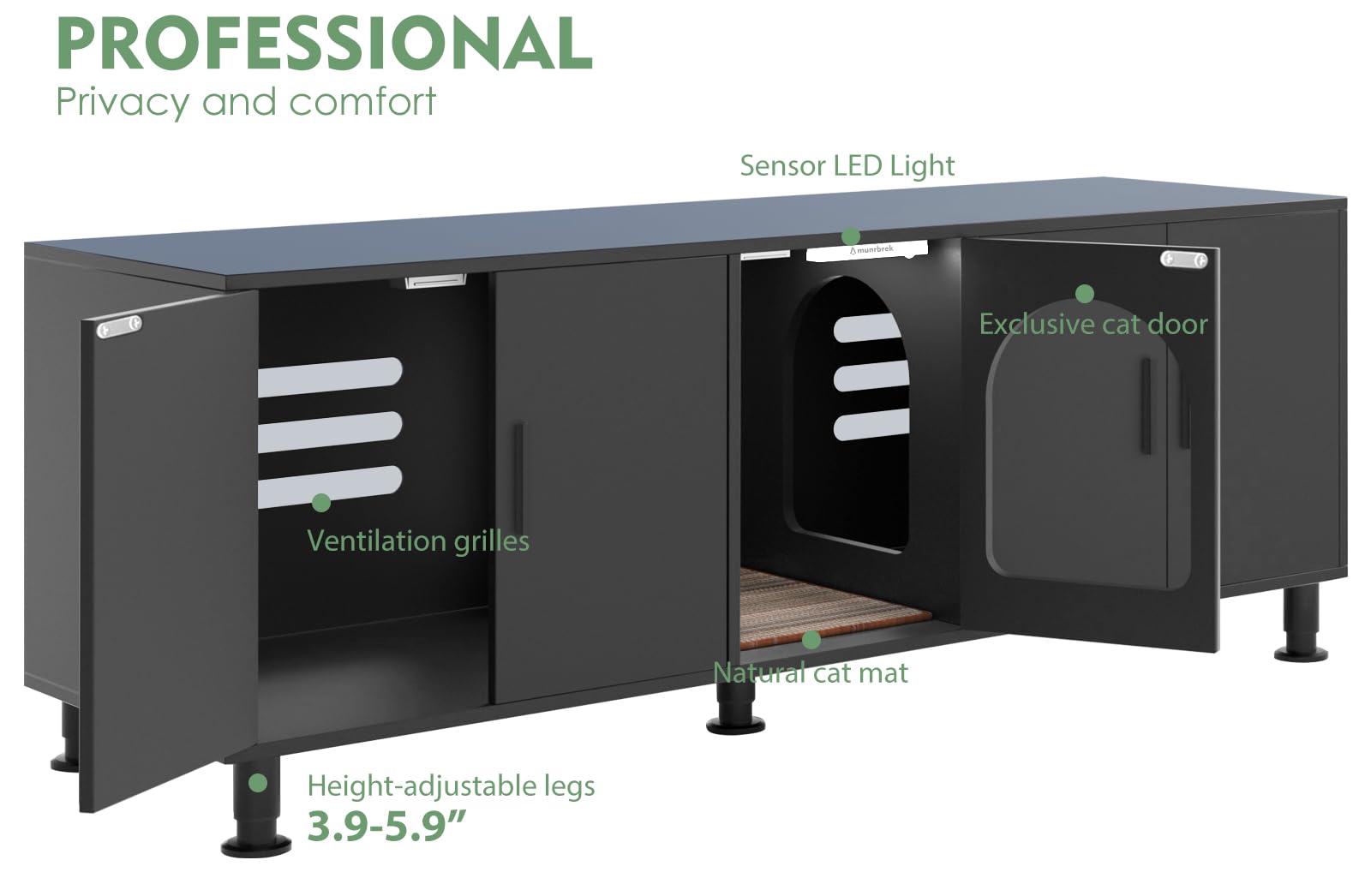 Amunrbrek Double Litter Box Enclosure, Litter Box Enclosure for 2 Litter Boxes, Modern Litter Box Furniture for 2 Cats, with Cat Door & Motion Light (Black)