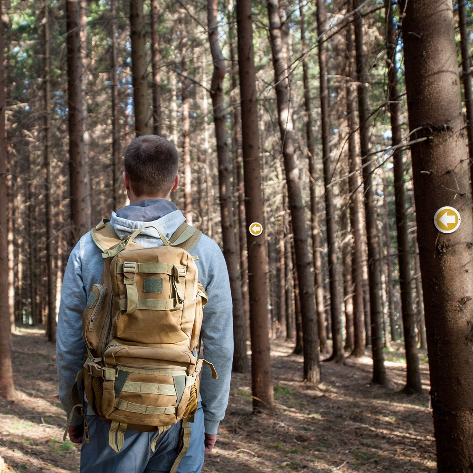 The trail markers for hiking are round shape, and about 2.99 inches/ 7.6 cm in diameter, very clear, not easy to fade, and the right size is easy to carry around.