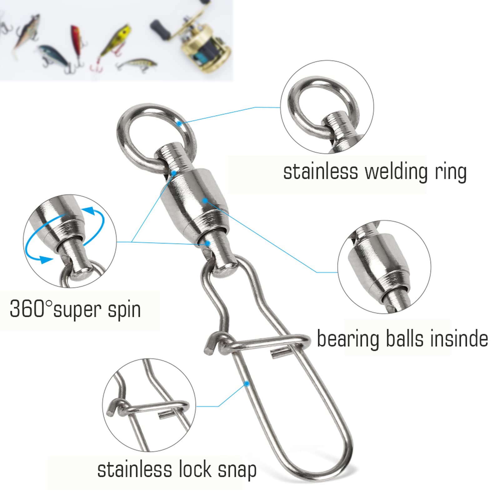 - Faster Rotation: 6 stainless bearing balls reloaded inside the stainless barrel swivelsl. The fishing line ball bearing swivels will freely rotated without fishing line twist.