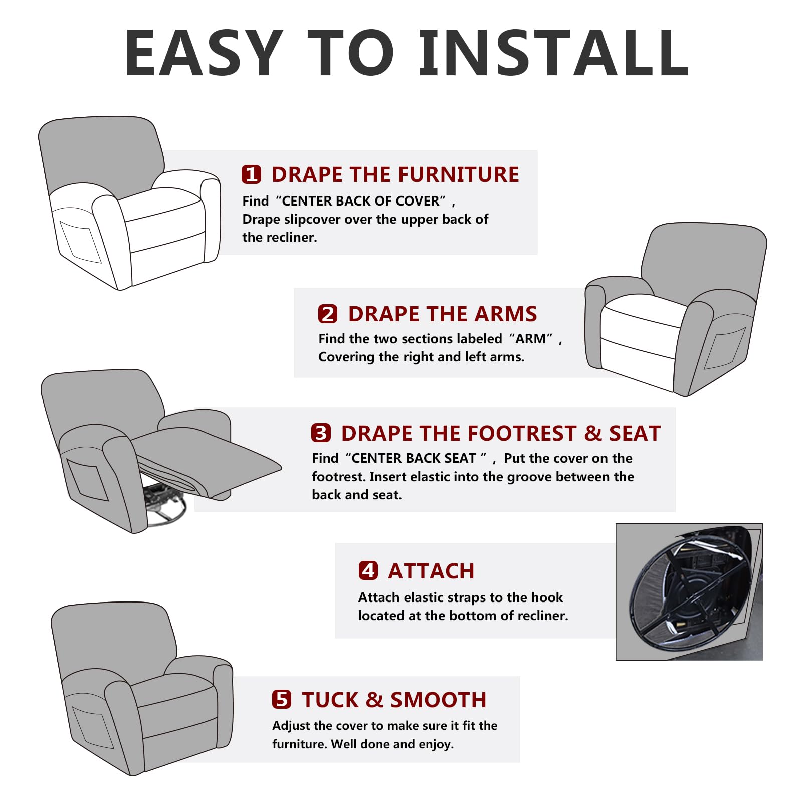 - EASY TO INSTALL: Our set of 4 recliner chair covers for lazy boy recliners includes 1 backrest cover, 1 footrest cover, and right and left arm covers. Effortlessly install in just a few minutes with the guide paper included in the package