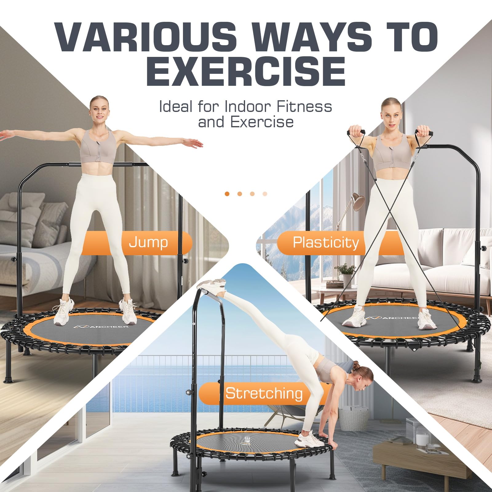 - ANCHEER 40' Foldable Mini Trampoline - Max Load 350lbs - 450lbs Indoor Trampoline - with 4 Level Adjustable Foam Handle and Resistance Bands - Adult exercise trampoline for Home,Gym and Garden(Orange)