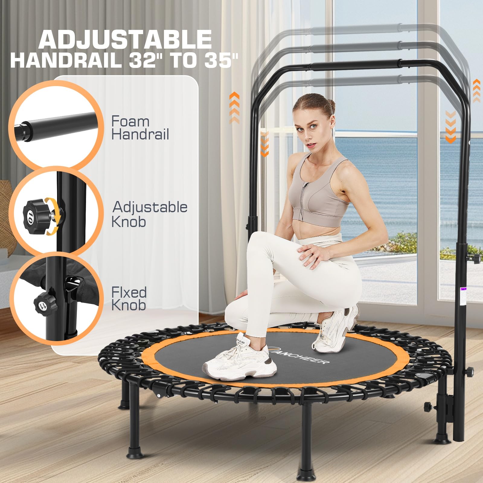 Details: ANCHEER 40' Foldable Mini Trampoline - Max Load 350lbs - 450lbs Indoor Trampoline - with 4 Level Adjustable Foam Handle and Resistance Bands - Adult exercise trampoline for Home,Gym and Garden(Orange)