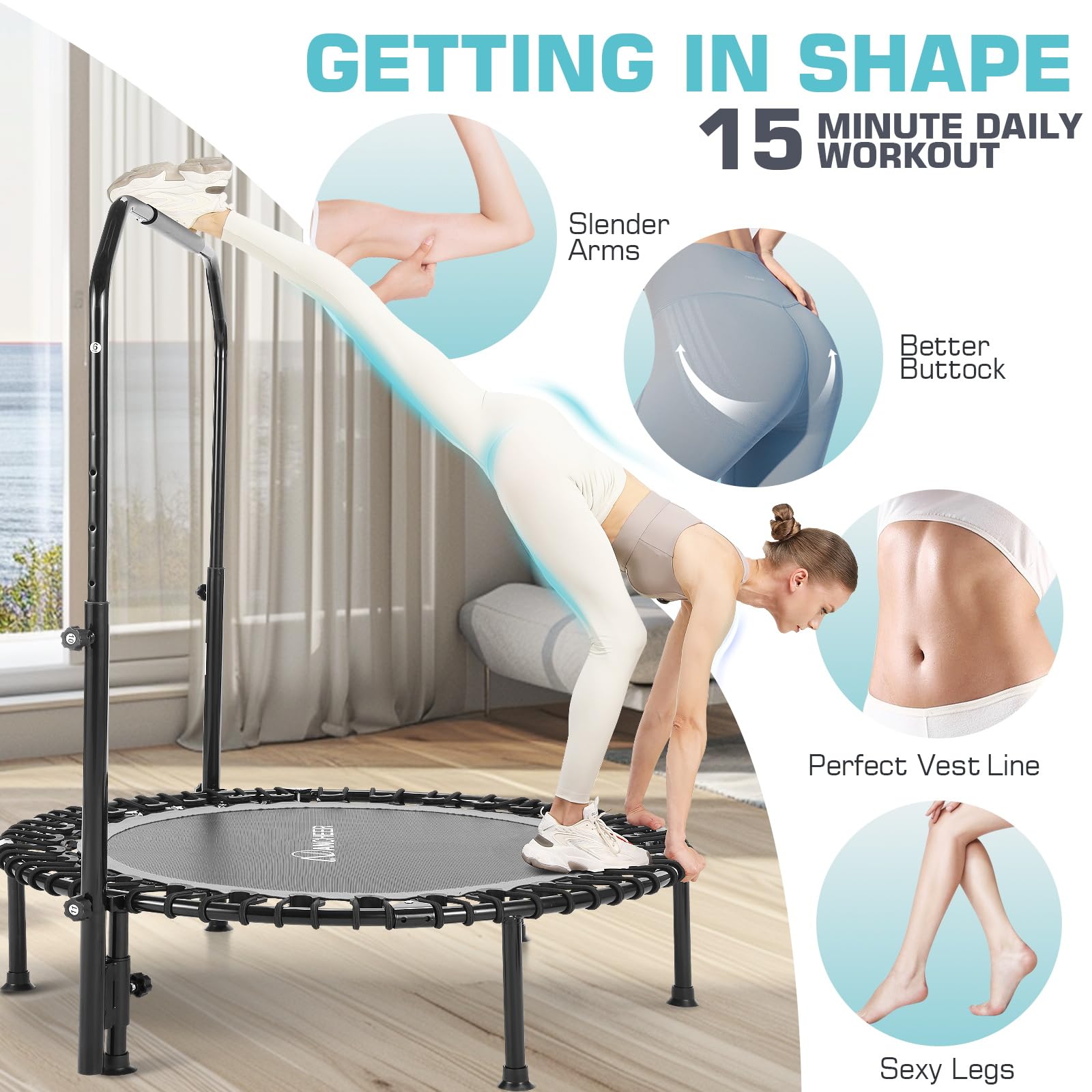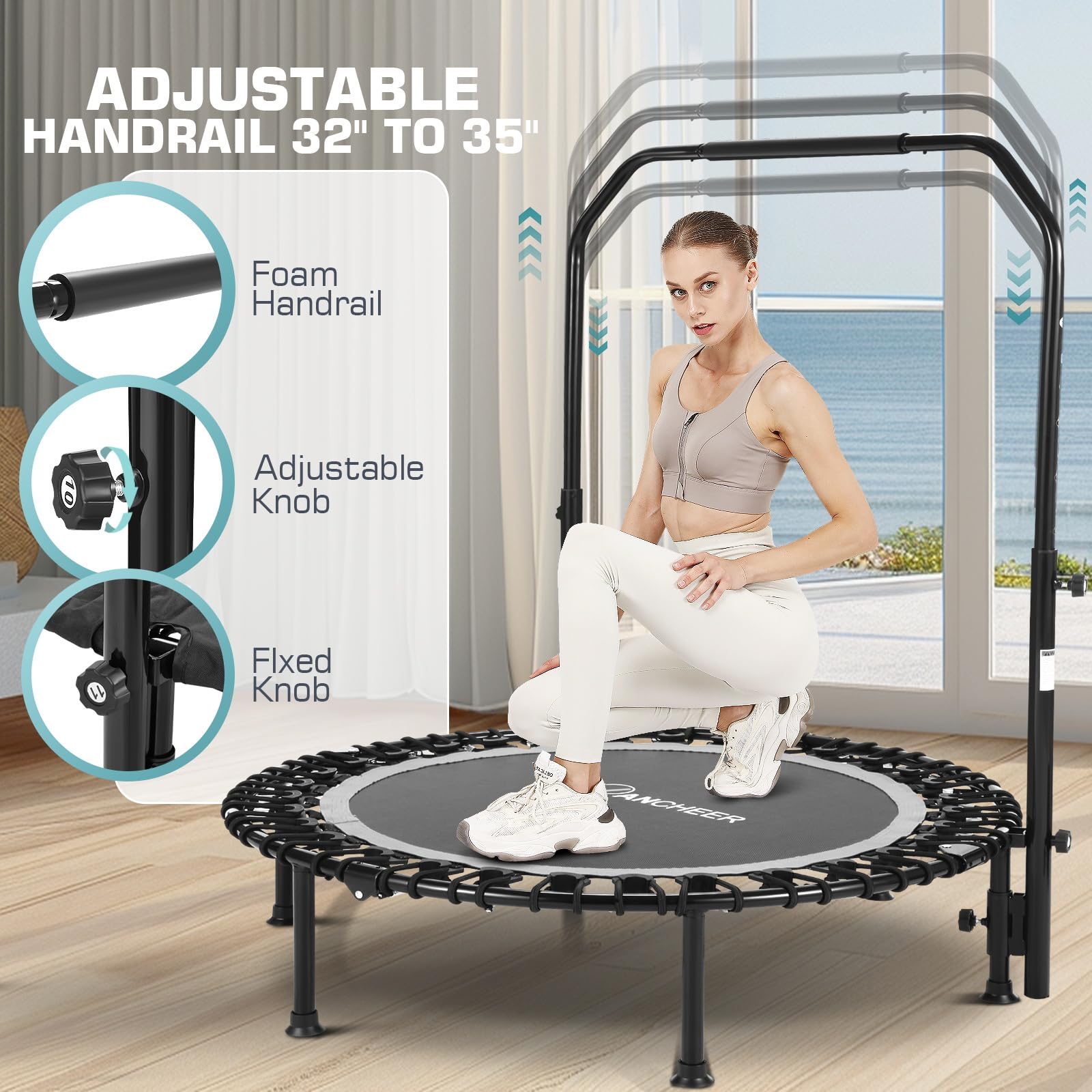 - ANCHEER 40' Foldable Mini Trampoline - Max Load 350lbs - 450lbs Indoor Trampoline - with 4 Level Adjustable Foam Handle and Resistance Bands - Adult exercise trampoline for Home,Gym and Garden(Silver)