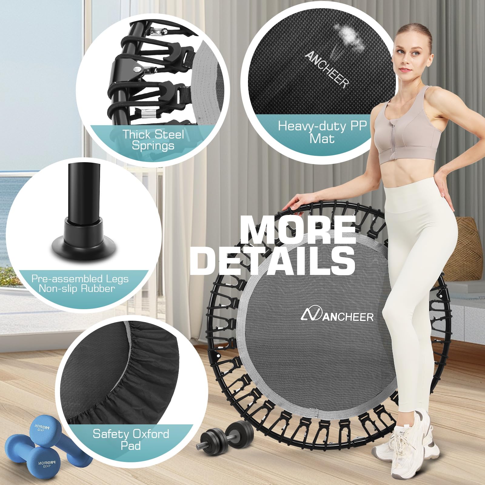 Details: ANCHEER 40' Foldable Mini Trampoline - Max Load 350lbs - 450lbs Indoor Trampoline - with 4 Level Adjustable Foam Handle and Resistance Bands - Adult exercise trampoline for Home,Gym and Garden(Silver)