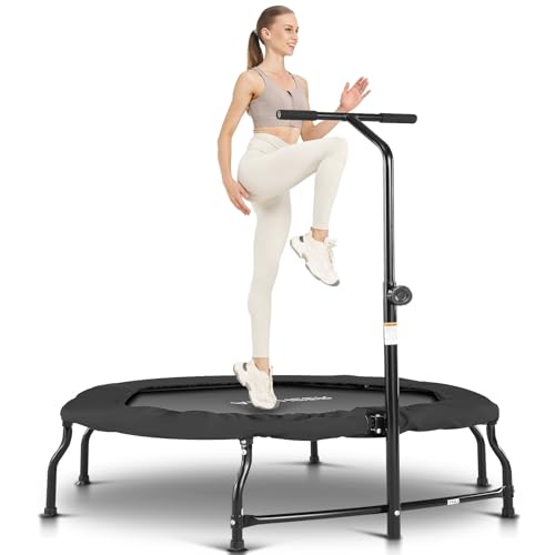 - 【3 Levels Adjustable Handle】3 levels of height adjustable handle (up to 50 inches), suitable for adults and teenagers. Foam-covered handrails prevent sweat from corroding the handles, which enhances balance, flexibility and coordination. Removable handrail bars are designed for easy carrying and storage of the trampoline. Maximum weight capacity 550 lbs.