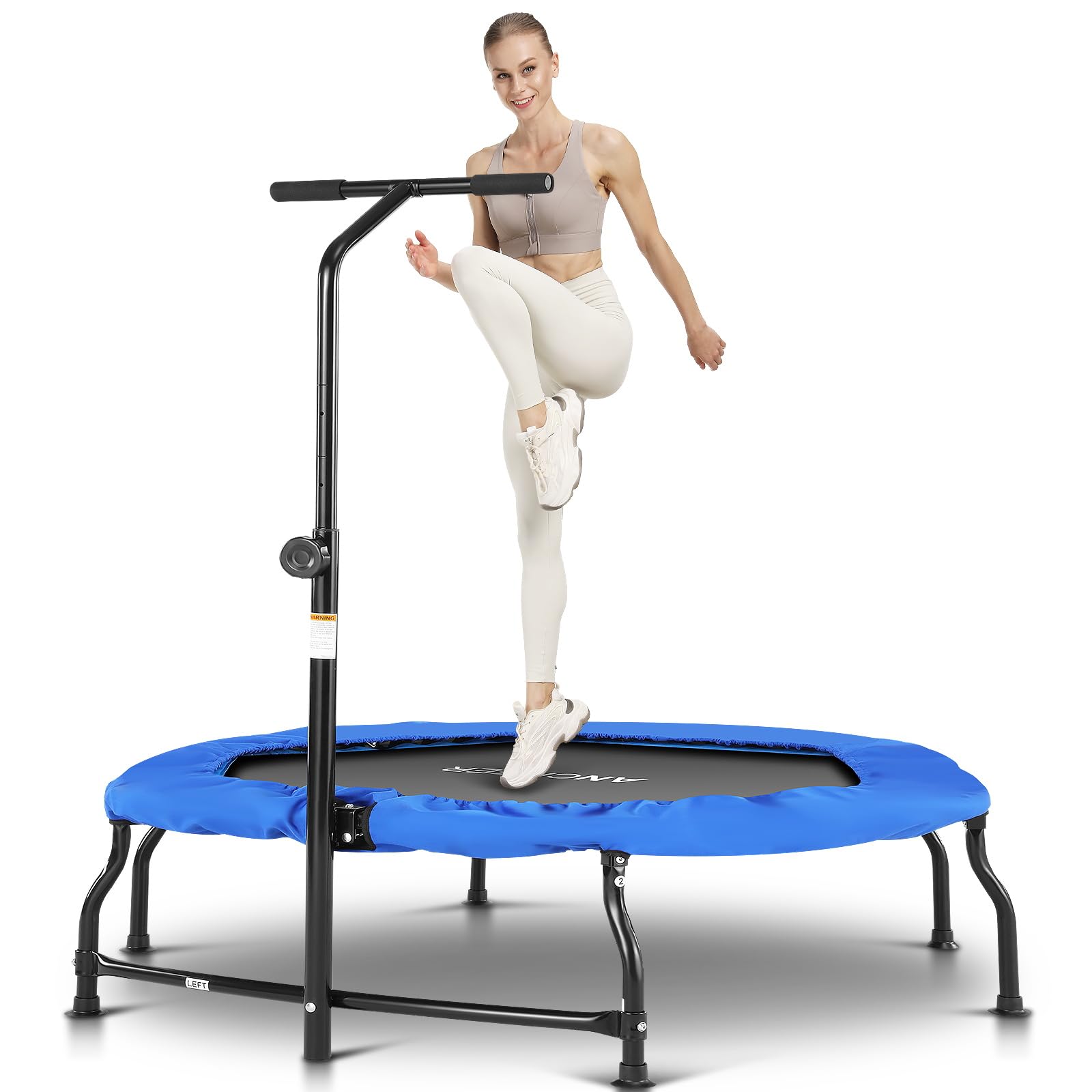 - 【3 Levels Adjustable Handle】3 levels of height adjustable handle (up to 50 inches), suitable for adults and teenagers. Foam-covered handrails prevent sweat from corroding the handles, which enhances balance, flexibility and coordination. Removable handrail bars are designed for easy carrying and storage of the trampoline. Maximum weight capacity 550 lbs.