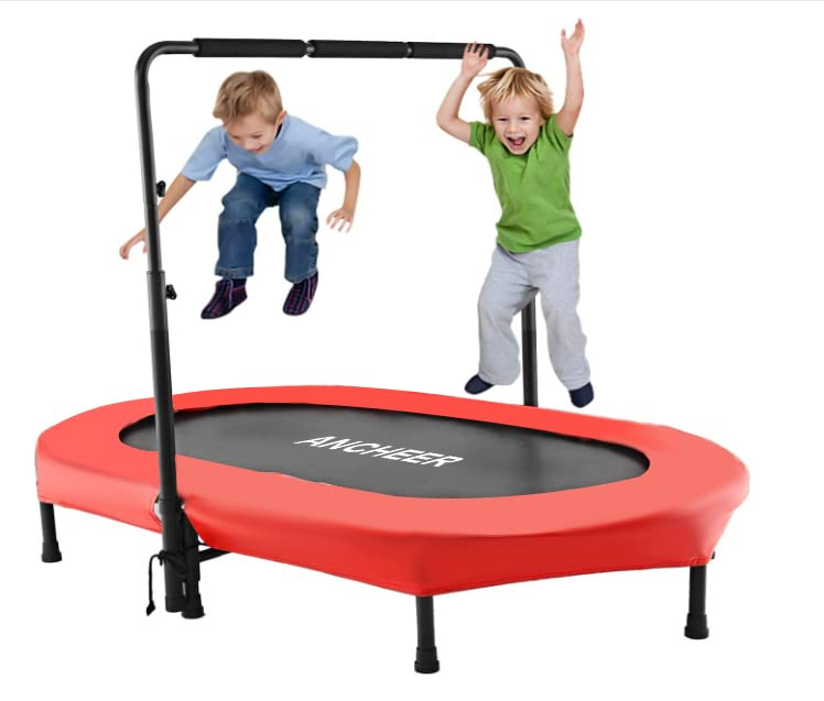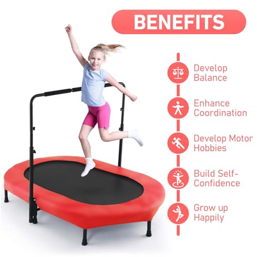 - ADJUSTABLE HANDLE BARS: This kids trampoline indoor comes with adjustable handle bars with 5 height levels to choose from and adjustments ranging from 38 to 45 inches for all ages.
