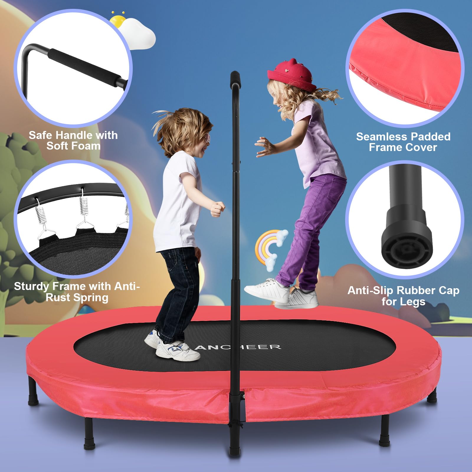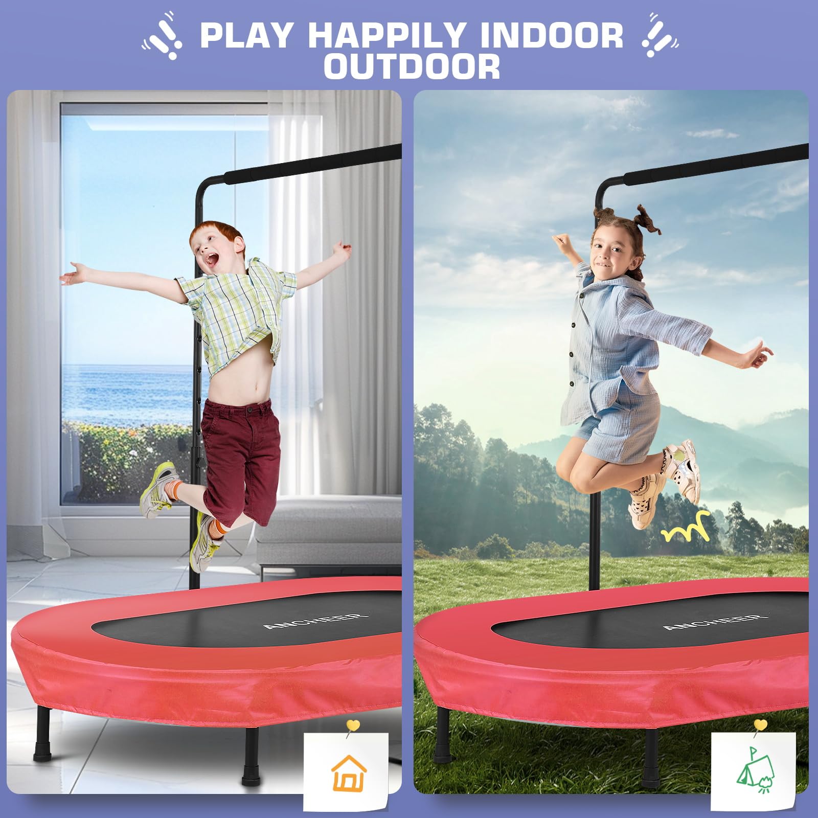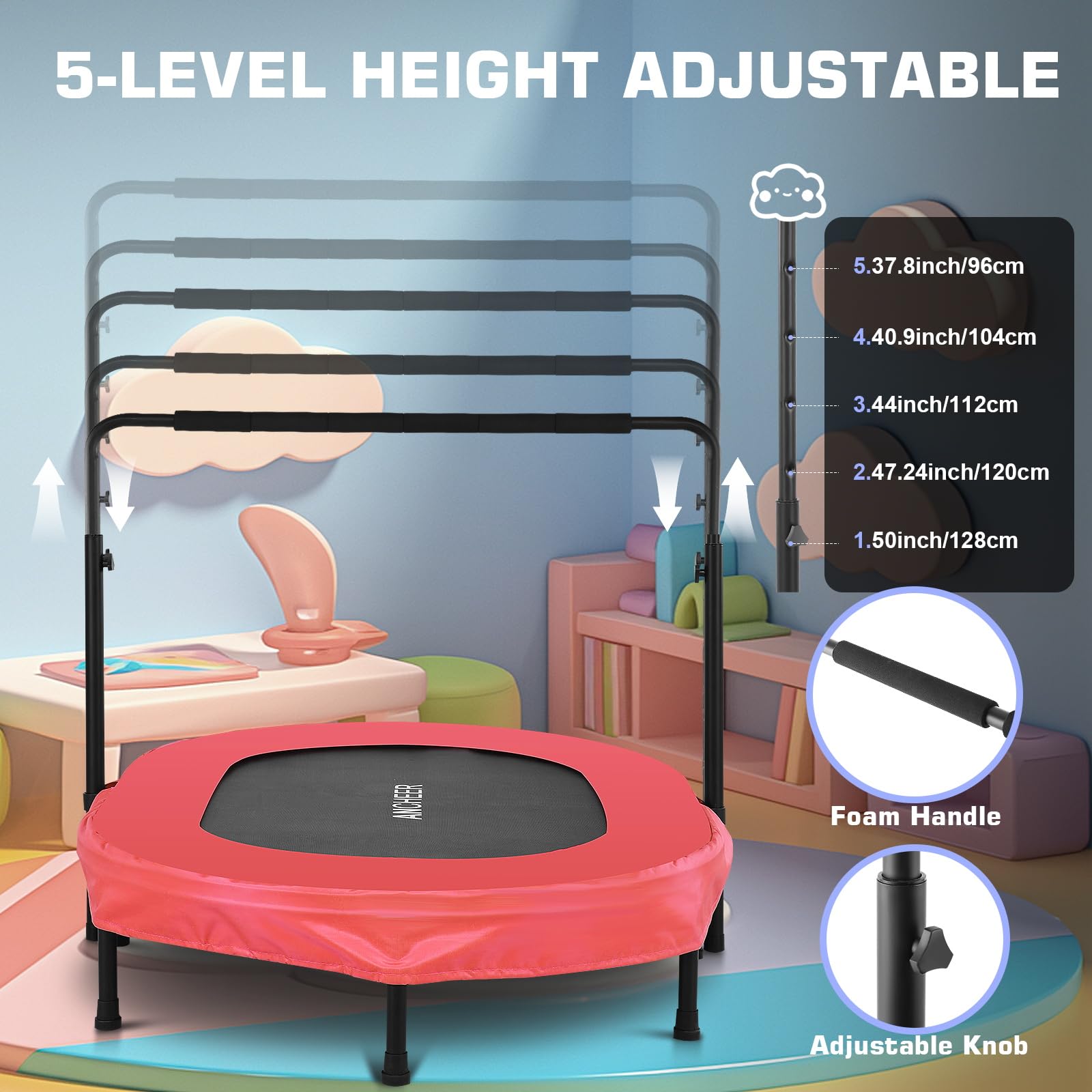 - ADJUSTABLE HANDLE BARS: This kids trampoline indoor comes with adjustable handle bars with 5 height levels to choose from and adjustments ranging from 38 to 45 inches for all ages.