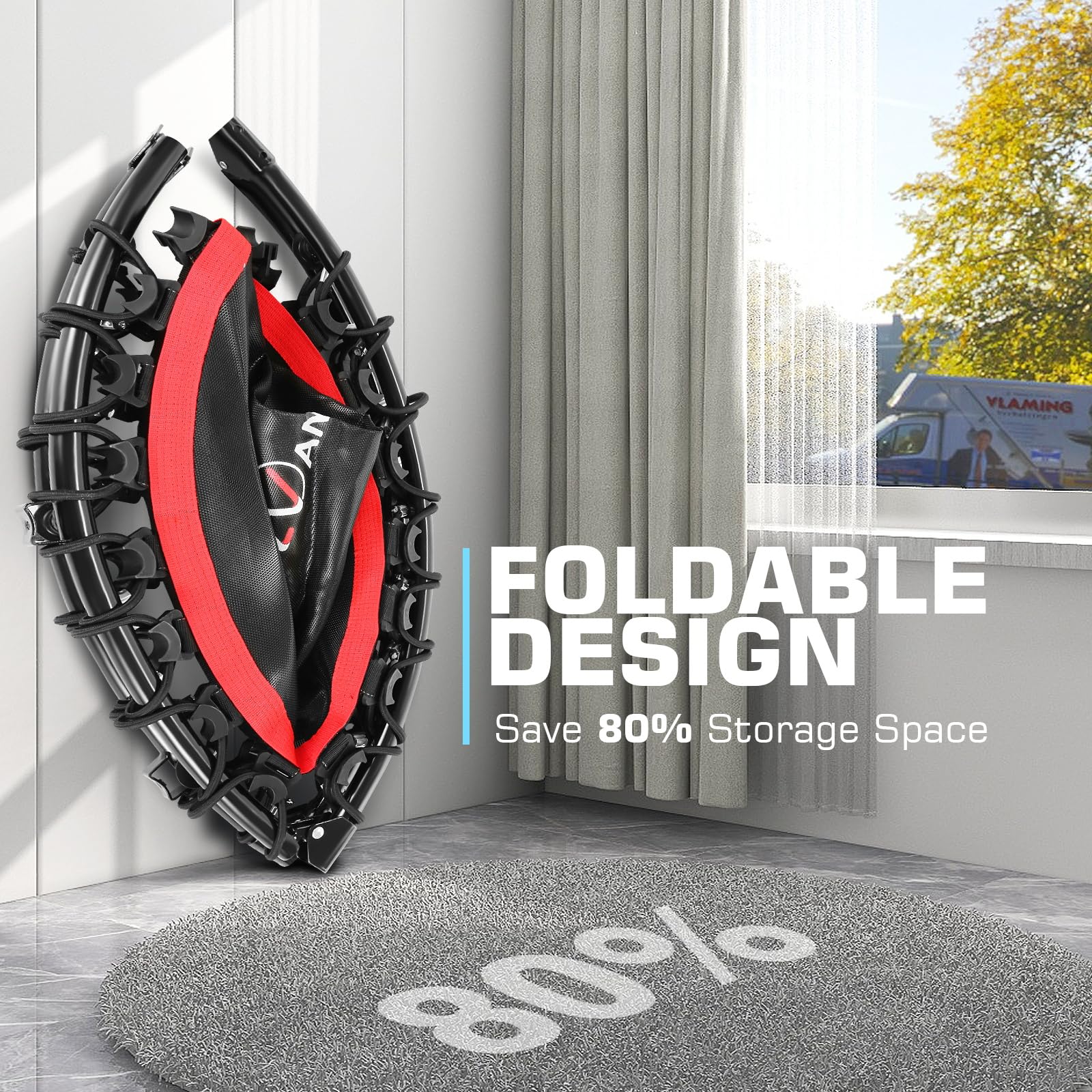 - 【Portable Foldable Trampoline 】 Fitness Rebounder Unique foldable frame structure, the folded size is 15' X 30'. Only 20% of the fully unfolded size. Easy to store the backboard anywhere, bed, sofa, car trunk, closet, etc.You can put it into the car, under the bed and sofa or the closet,etc. We provide you with 6 detachable rubber-tipped legs which can effectively reduce noise and protect your floor space.