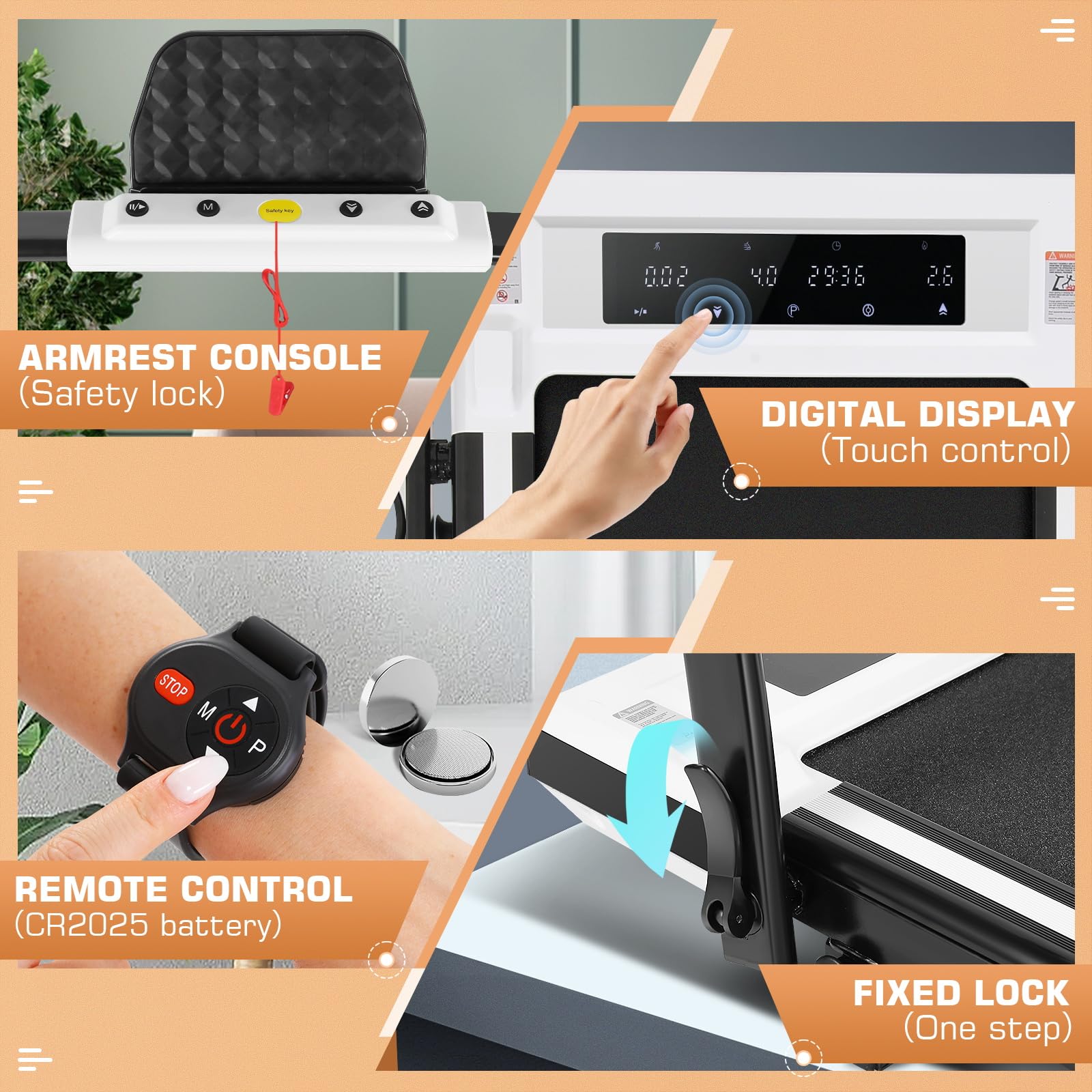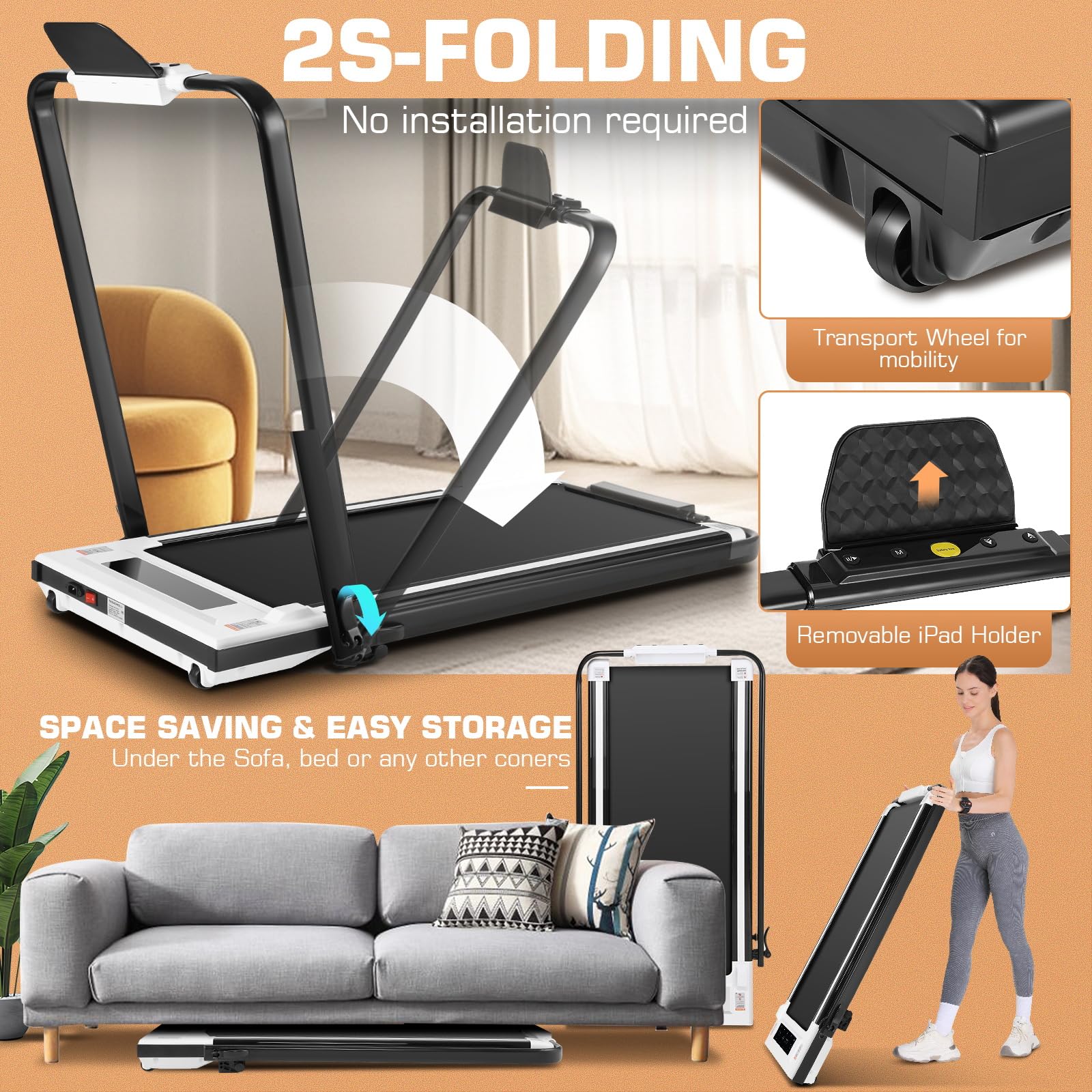 - ă2s Folding Treadmills for HomeăNo assembly is required, the treadmill can be used directly after unboxing, but before operating the machine, ensure the safety key is connected. The one-step folding system allows the treadmill to be folded in just 2s. This walking mat is only 4.5 inches thick, allowing you to hide it under your couch or bed. The front transport wheels make it easy to move anywhere, perfect for homes, apartments, and offices